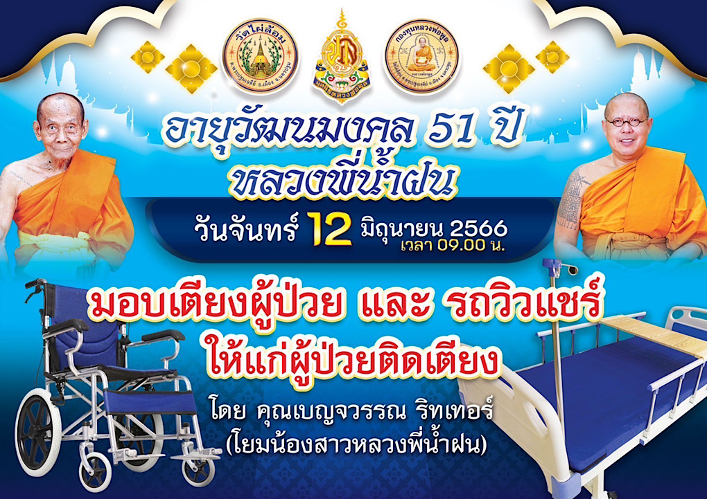 ต่อจากนั้นมีพิธีมอบเตียงผู้ป่วย และ รถวิวแชร์ให้แก่ผู้ป่วยติดเตียงโดยการร่วมทำบุญของคุณเบญจวรรณ ริทเทอร์(โยมน้องสาวหลวงพี่น้ำฝน)เป็นเจ้าภาพ