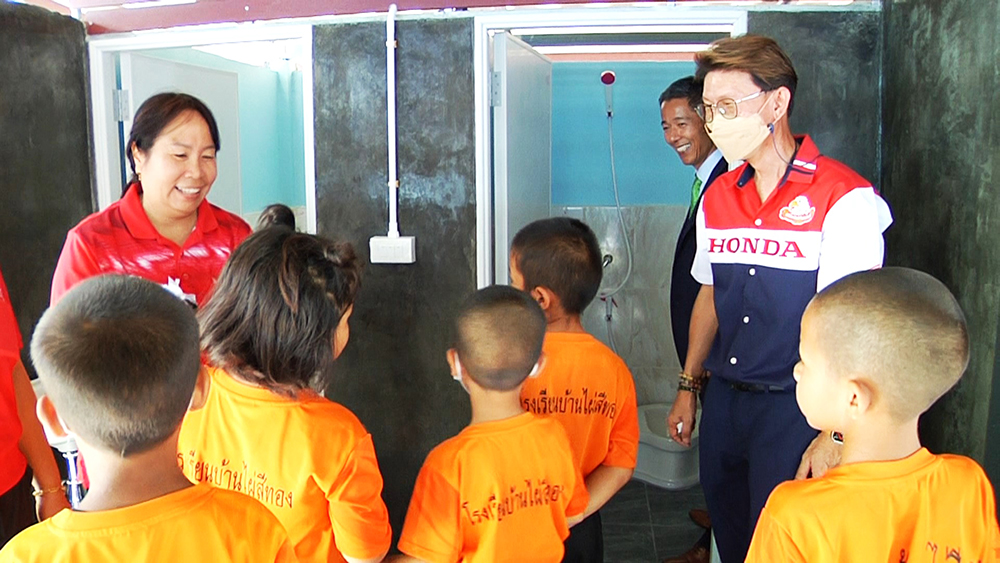 จากนั้นได้ไปเยี่ยมชมห้องสุขาของเด็กๆที่ได้มาตฐาน และคณะได้แจกเงิน ข้าวสาร ขนม ไอศกรีม เนื่องจากมีเจ้าภาพหลายคน ของที่มาร่วมแจกก็มีเป็นจำนวนมาก กลัวเด็กๆจะถือกลับบ้านลำบาก แต่ไม่ใช่ปัญหา เมื่อเห็นของแจกเด็กมีจำนวนมาก คุณครูจึงจัดเตรียมถุงพลาสติกถุงผ้าลดโลกร้อนให้เด็กๆทุกคน นำไปใส่ของแจกเรียกว่าหิ้วถุงกันตัวเอียงไปเลย และรู้ว่าผู้ใหญ่ใจดีมีชาวญี่ปุ่นมาด้วย เลยพูดขอบคุณ เป็นภาษาญี่ปุ่นว่าอาริกาโต้ และล้อมวง ร้องเพลงไทยขอบคุณผู้ใหญ่ใจดี