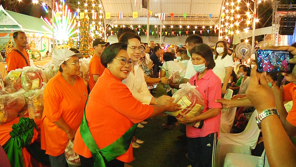 หลังเสร็จพิธีนางไพรัตน์ อ่อนดำ หรือป้าติ๋ว พร้อมกลุ่มเพื่อนป้าติ๋ว ได้ร่วมกันแจกถุงยังชีพ ข้าวสาร หารแห้ง น้ำมันพืช และน้ำพริกป้าติ๋ว ให้กับพี่น้องประชาชน ผู้มีรายได้น้อย ชาว ต.ท่าระหัด อ.เมือง จ.สุพรรณบุรี จำนวน 200 ชุด เพื่อเป็นการช่วยเหลือและลดภาระค่าใช้จ่ายในครัวเรือนให้กับประชาชน เนื่องจาก นางไพรัตน์ อ่อนดำ หรือป้าติ๋ว เป็นชาวบ้านคันทด ตำบลท่าระหัด อำเภอเมืองสุพรรณบุรี แต่ได้ไปทำธุรกิจ น้ำพริกป้าติ๋ว ที่ กทม. จนกระทั่งธุรกิจน้ำพริกป้าติ๋วประสบความสำเร็จมีโชคลาภร่ำรวย จึงได้กลับมาช่วยเหลือพี่น้องประชาชนและเพื่อนๆที่เคยเรียนมาด้วยกันที่บ้านเกิด ซึ่งในงานมีอาหารคาว หวาน ก๋วยเตี๋ยว ลูกชิ้น ข้าวแกง ส้มตำ ตำแตง เหยาะน้ำปลาร้าป้าติ๋ว รสเด็ดและแซบอย่าบอกใคร และน้ำดื่ม มาเลี้ยงให้ผู้ที่มาร่วมพิธีได้รับประทานฟรีตลอดงาน