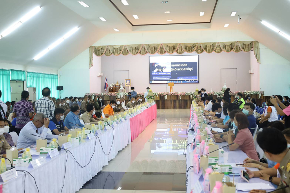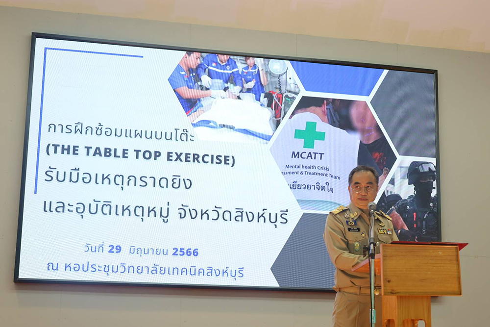 ซ้อมแผน – วันที่ 29 มิถุนายน 2566 ณ หอประชุมวิทยาลัยเทคนิคสิงห์บุรี นายสุพจน์ ยศสิงห์คำ ผู้ว่าราชการจังหวัดสิงห์บุรี เป็นประธานในพิธีเปิดการฝึกซ้อมแผน พร้อมด้วย นายสมชาย ลีหล้าน้อย รองผู้ว่าราชการจังหวัดสิงห์บุรี หัวหน้าส่วนราชการ ตำรวจ นักเรียน มูลนิธิต่างๆ ร่วมประชุมซ้อมแผนรับมือเหตุกราดยิงดังกล่าวบนโต๊ะ โดยจะจัดให้มีการซ้อมแผนเสมือนจริง จะมีขึ้นในวันที่ 30 มิถุนายน 2566นี้ ที่ วิทยาลัยเทคนิคสิงห์บุรี และโรงเรียนมัธยมเทศบาล4 อำเภอเมืองสิงห์บุรี สำหรับรูปแบบการฝึกซ้อมเป็นการบูรณาการฝึกซ้อมร่วมกันหลายหน่วยงานที่เกี่ยวข้อง โดยใช้สถานการณ์จำลอง เป็นชายวัยกลางคนมีประวัติเสพยาและการรักษาอาการทางจิต คุ้มคลั่งขับรถยนต์มาจอดหน้าบริเวณประตูทางเข้าวิทยาลัยเทคนิคสิงห์บุรี รปภ.เรียกเพื่อสอบถาม