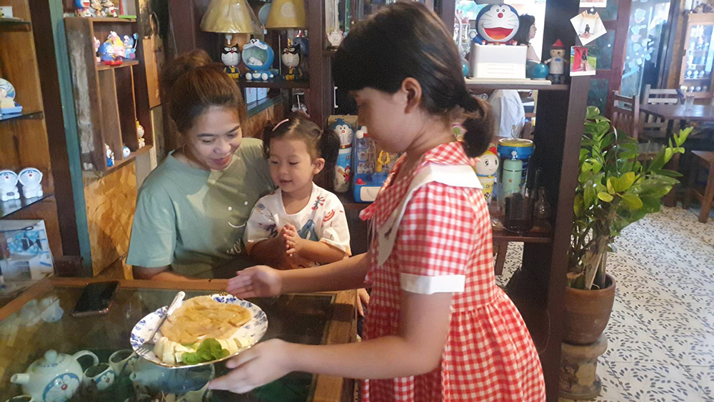 กาญจนบุรี คุณปุ้มเปิดบ้านท้าคอแมวอ้วนสีฟ้าแวะเข้ามาชม พร้อมแชะแบบฟรีๆ แล้วค่อยชิมเมนูในร้านที่มีทั้งคาวหวาน แถมช่วงนี้ต้องลองโรตีทุเรียนหมอนทองของดีของเด็ดของดังบ้านทองผาภูมิ ซึ่ง 365 วัน แต่ละปีมีไม่บ่อยครั้ง