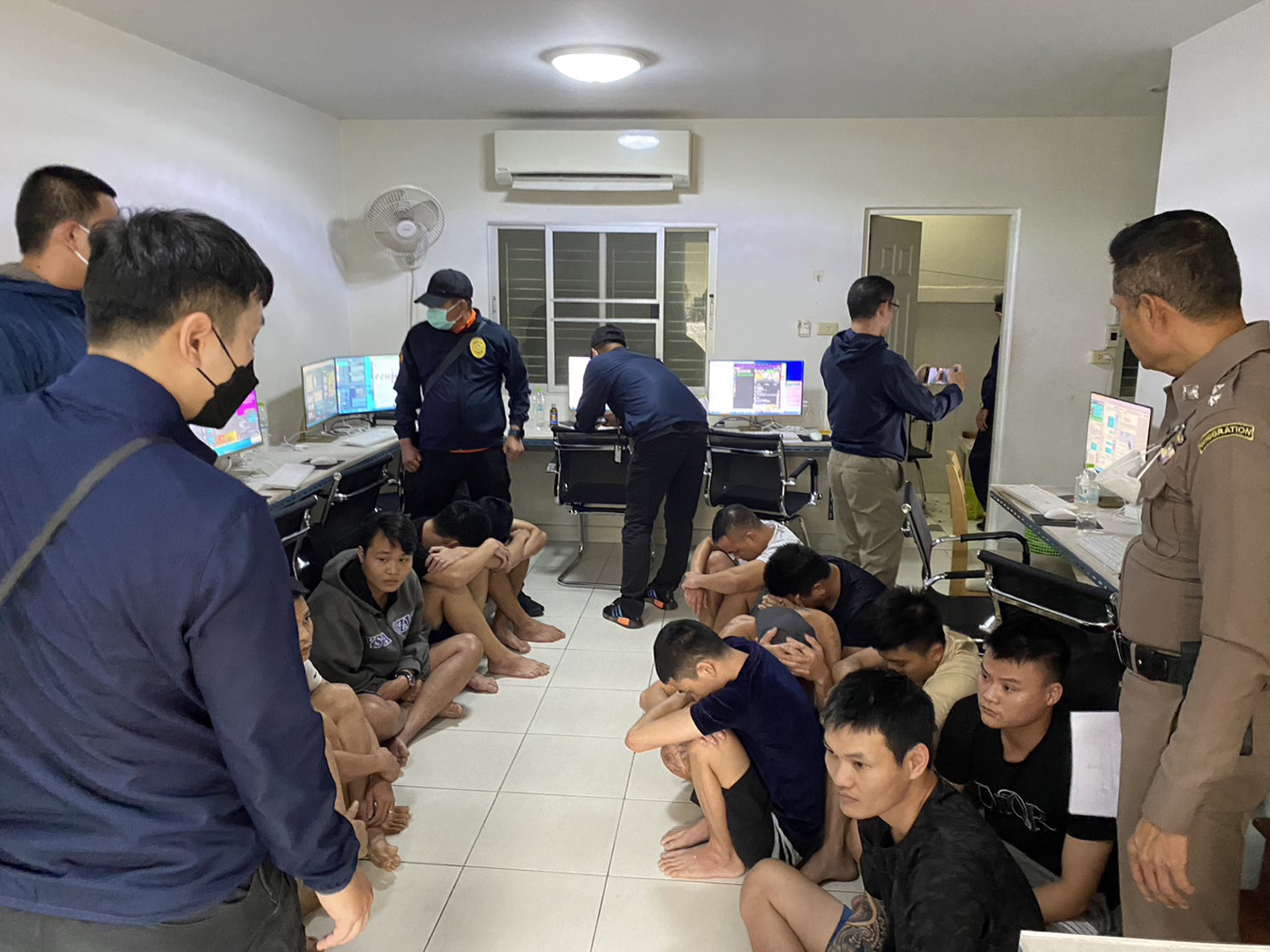 *****สืบเนื่องมาจาก เจ้าหน้าที่ฝ่ายสืบสวนของตรวจคนเข้าเมือง ได้สืบทราบว่ามีกลุ่มบุคคลต่างด้าวลักลอบเช่าบ้านเลขที่ 3/439 หมู่บ้านนิรันดรวิลล์ 10 ถ.วัดศรีวารีน้อย ต.บางโฉลง อ.บางพลี จ.สมุทรปราการ เปิดเป็นฐานการตั้งเว็บพนันออนไลน์และการปลอมแปลงเอกสารหนังสือเดินทาง ซึ่งมีเงินหมุนเวียนหลายสิบล้านบาท ฝ่ายสืบสวนจึงเฝ้าสังเกตการณ์จนกระทั่งมีเบาะแสแน่ชัดจึงขออนุมัติหมายค้นจากศาลจังหวัดสมุทรปราการ และวางแผนนำกำลังไปปิดล้อมเข้าตรวจค้นภายในบ้านจำนวน 3 หลัง โดยหลังแรกพบกลุ่มพนักงานต่างด้าวสัญชาติเวียดนามมีทั้งชายและหญิง ซึ่งกำลังทำหน้าที่เป็นแอดมินของเว็บพนันออนไลน์ ที่มีนายทุนเป็นชาวจีนอยู่เบื้องหลัง พร้อมกับยึดของกลางเป็นคอมพิวเตอร์จำนวน 12 เครื่อง และอีกสองหลังที่อยู่ติดกัน พบต่างด้าวทั้งชายหญิงสัญชาติเวียดนาม และพบของกลาง อุปกรณ์การทำหนังสือพาสปอร์ตปลอม และตรายางขาเข้า/ออก ตม.ทอ.สุวรรณภูมิ และประเทศพม่าและกัมพูชา รวมไปถึงพบบุหรี่ต่างประเทศหนีภาษีจำนวนหนึ่ง จึงควบคุมผู้ต้องหาทั้งหมดซึ่งเป็นชาวเวียดนาม พร้อมกับของกลาง ส่งพนักงานสอบสวน สภ.บางพลี เพื่อทำการสอบสวนและแจ้งข้อกล่าวหาต่อไป