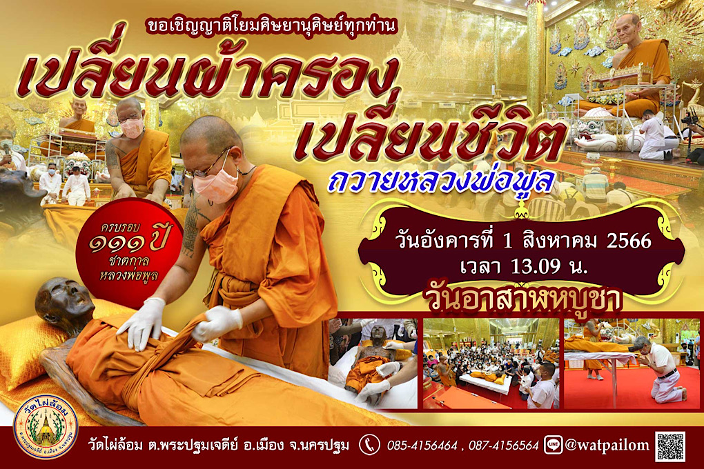 ในปีนี้เป็นวาระพิเศษ 111 ปีชาตกาลพระเดชพระคุณหลวงพ่อพูล 11 พฤศจิกายน 2455 –11 พฤศจิกายน 2566 ในการเปลี่ยนผ้าครองสรีระสังขารพระเดชพระคุณหลวงพ่อพูล ก็จะมีของที่ระลึก เป็นชิ้นส่วนจีวรของพระเดชพระคุณหลวงพ่อพูล เพื่อให้ศิษยานุศิษย์เก็บไว้บูชาเป็นสิริมงคล เป็นเครื่องยึดเหนี่ยวจิตใจด้วย การได้ร่วมบุญเปลี่ยนผ้าครองถวายหลวงพ่อพูลนั้น ถือเป็นการบูชาผู้มีพระคุณประการหนึ่ง จึงมีอานิสงส์มาก อาจเปลี่ยนชีวิตของคนให้ไปในทางที่ดีได้ เจริญขึ้นได้ อาตมาจึงขอเจริญพรประชาสัมพันธ์พิธีดังกล่าวนี้แก่สาธุชนทั้งหลายผู้มีจิตศรัทธา โดยสามารถมาร่วมงานได้ที่วิหารหลวงพ่อพูล วัดไผ่ล้อม จังหวัดนครปฐม ในวันที่ 1 สิงหาคม 2566 เวลา 13.09 น. ขอเจริญพร