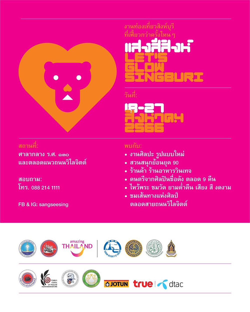 งานเทศกาลส่งเสริมการท่องเที่ยว “แสง สี สิงห์ (Let’Glow Singburi)” กำหนดจัดขึ้นระหว่างวันที่ 18-27 สิงหาคม 2566 (10 วัน 10 คืน) ณ หน้าศาลากลางจังหวัดสิงห์บุรี (หลังเดิม ร.ศ. ๑๓๐) โดยมีวัตถุประสงค์เพื่อให้จังหวัดสิงห์บุรี เป็นพื้นที่นำร่องในการพัฒนาการท่องเที่ยวเมืองรองรูปแบบใหม่ เพื่อดึงดูดนักท่องเที่ยวโดยเฉพาะคนรุ่นใหม่ให้เข้ามาในจังหวัดเพิ่มขึ้น ตลอดจนกระตุ้นเศรษฐกิจ รวมถึงกระจายรายได้ และเสริมสร้างศักยภาพในการแข่งขันให้กับผู้ประกอบการรายย่อยในพื้นที่ได้อย่างยั่งยืน