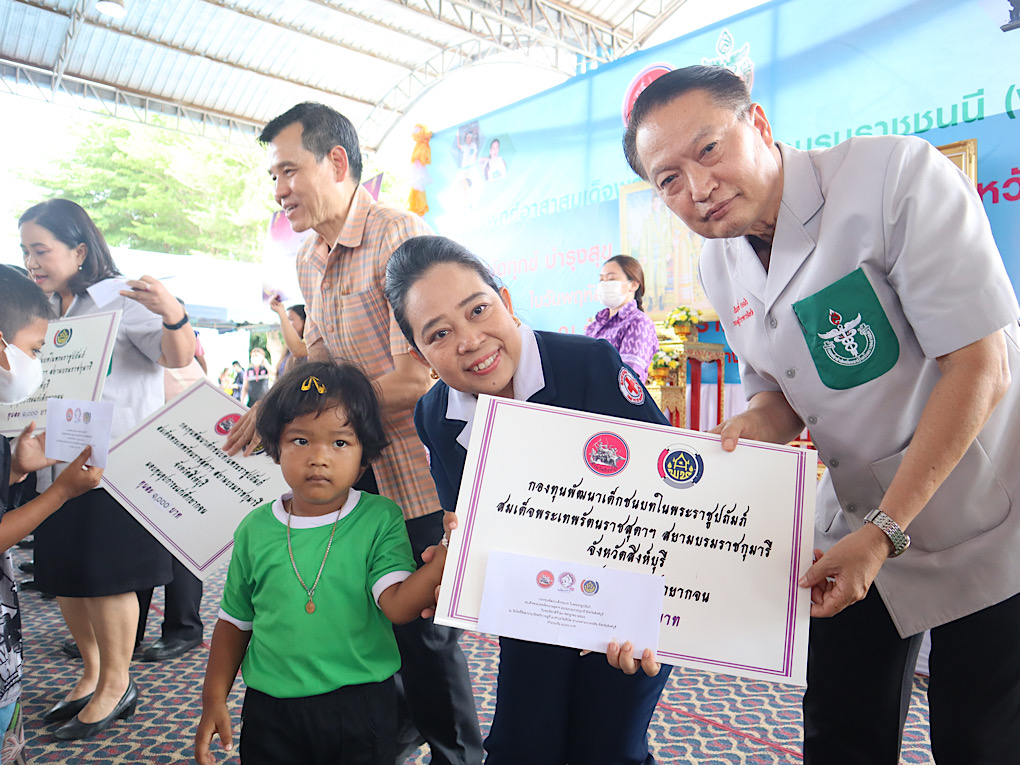 โดยมอบเครื่องอุปโภค-บริโภค แก่ผู้สูงอายุ ผู้พิการ และผู้ยากไร้ จากเหล่ากาชาดจังหวัดสิงห์บุรี จำนวน 100 ชุด และมอบแว่นสายตายาวให้แก่สูงอายุ/ผู้ยากไร้ จำนวน 500 อัน และสำนักงานพัฒนาชุมชนจังหวัดสิงห์บุรี ได้มอบทุนในกองทุนพัฒนาเด็กชนบทในพระราชูปถัมภ์จังหวัดสิงห์บุรี จำนวน 10 ทุนๆละ 1,000 บาท สำนักงานพัฒนาสังคมและความมั่นคงของมนุษย์ฯ มอบเงินสงเคราะห์เด็ก จำนวน 20 ครอบครัวๆละ 1,000 บาท พร้อมได้ตรวจเยี่ยมหน่วยแพทย์อาสาสมเด็จพระราชชนนี (พอ.สว.) และหน่วยงานที่ออกบริการประชาชน ณ วัดโพธิ์สังฆาราม หมู่ 7 ตำบลโพสังโฆ อำเภอค่ายบางระจัน จังหวัดสิงห์บุรี