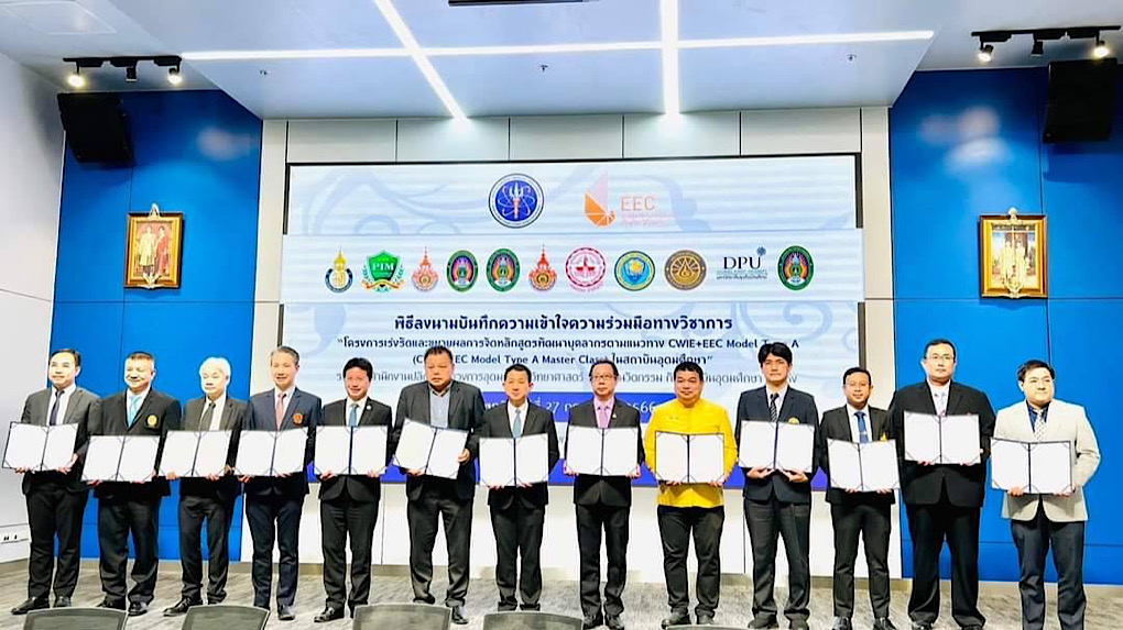 มทร.รัตนโกสินทร์ นำโดย รศ.ดร.อุดมวิทย์ ไชยสกุลเกียรติ อธิการบดี ร่วมพิธีลงนามบันทึกความเข้าใจความร่วมมือทางวิชาการ (MOU) “โครงการเร่งรัดและขยายผลการจัดหลักสูตรพัฒนาบุคลากรตามแนวทาง CWIE+EEC Model Type A (CWIE+EEC Model Type A Master Class) ในสถาบันอุดมศึกษา” ระหว่างสำนักงานปลัดกระทรวงการอุดมศึกษา วิทยาศาสตร์ วิจัยและนวัตกรรม กับ สถาบันอุดมศึกษา 11 แห่ง