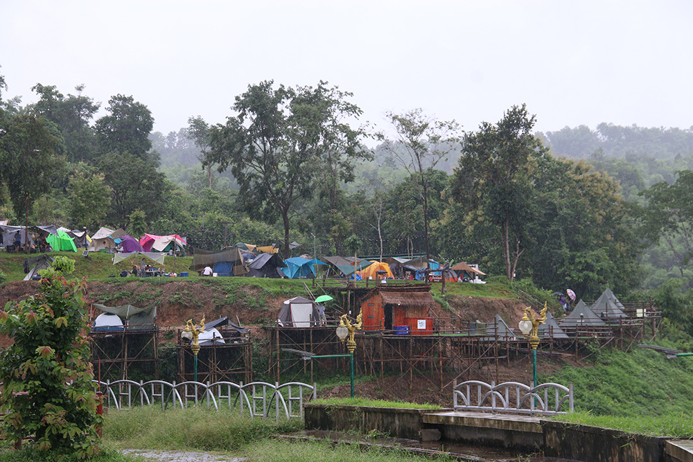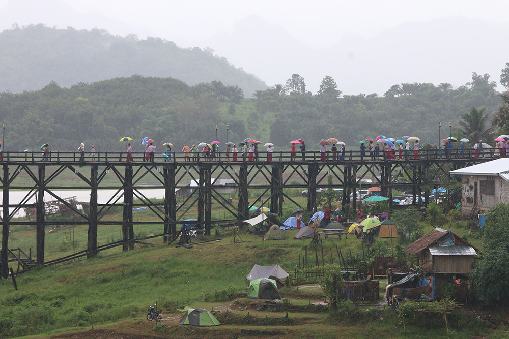 เช้าวันนี้ 30 กรกฎาคม 2566 ที่บริเวณหมู่บ้านวังกะหมู่ที่ 2 ตำบลหนองลู อำเภอสังขละบุรี จังหวัดกาญจนบุรี สถานที่ท่องเที่ยวสำคัญ นักท่องเที่ยวยังคงเดินทางมาทำบุญใส่บาตร เลือกกินอาหารเช้า ซื้อสินค้าที่ระลึก และเดินเที่ยวบนสะพานมอญ ท่ามกลางสายฝนที่ตกลงมาอย่างไม่ขาดสายตั้งแต่ช่วงเย็นของวานที่ผ่านมา โดยนักท่องเที่ยวต้องซื้อเสื้อกันฝนและร่มเพื่อไม่ให้เปียก ซึ่งกลายเป็นภาพที่แปลกตาที่ไม่ค่อยได้เห็นกันบ่อยนัก จนทำให้หลายคนอดที่จะหยิบกล้องถ่ายรูปและโทรศัพท์มือถือบันทึกภาพเก็บไว้เป็นที่ระลึก