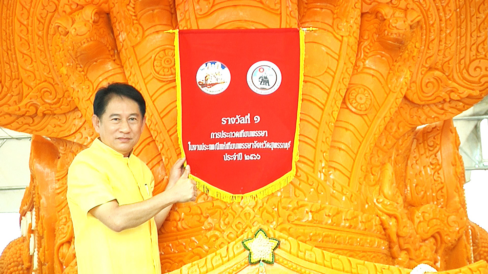 จากนั้นนายณัฐภัทร สุวรรณประทีป ผู้ว่าราชการจังหวัดสุพรรณบุรี ได้นำส่วนราชการและประชาชน ไปประกอบพิธีถวายเทียนจำนำพรรษาที่ศาลาสมเด็จพระนเรศวรมหาราช และมอบรางวัลให้กับอำเภอต่างๆทั้ง 10 อำเภอที่ส่งรถเทียนพรรษา และขบวนเทียนพรรษาเข้าร่วมแข่งขัน มีรางวัลชมเชย 7 รางวัล รางวัลรองชนะเลิศ 2 รางวัล รางที่ 1 อำเภออู่ทอง ที่ 3 อำเภอสามชุก และท่านผู้ว่าพร้อมคณะ ได้เดินทางไปติดป้ายรางวัลชนะเลิศให้กับรถเทียนของอำเภออู่ทอง โดยการปีนขึ้นบันได ไปติดป้ายที่หัวมังกร ซึ่งสูงถึง 4 เมตรพร้อมกับยืนถ่ายภาพร่วมกับ คณะนายอำเภออู่ทองและคณะกรรมการพัฒนาสตรีอำเภออู่ทอง เพื่อเป็นเกียรติ