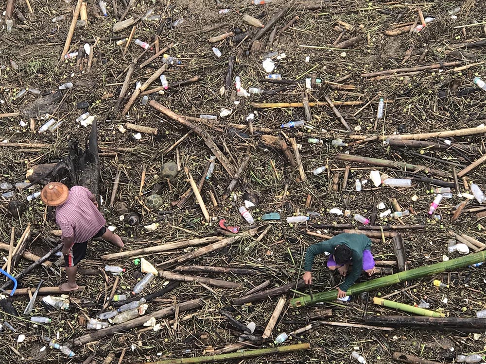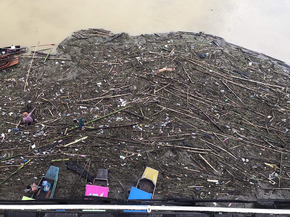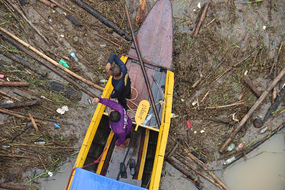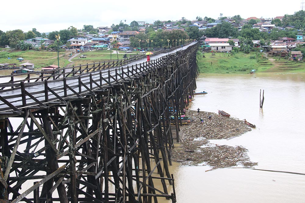 กาญจนบุรี ประชาชน จิตอาสา ผู้ประการเรือนำเที่ยว และเจ้าหน้าที่ เร่งเก็บกิ่งไม้ ท่อนไม้ และขยะจำนวนมากที่ลอยมาติดตอม่อสะพานไม้อุตตมานุสรณ์ หลังเกิดฝนตกหนักในพื้นที่อำเภอสังขละบุรีติดต่อกันหลายวัน เพื่อป้องกันสะพานฯไม่ให้เกิดความเสียหาย