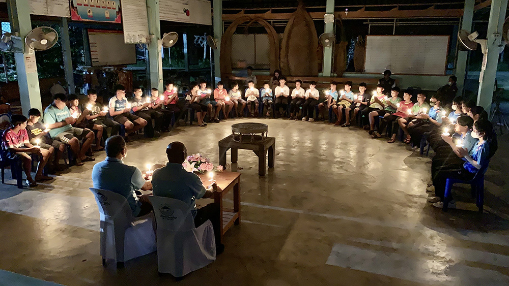 สำหรับการอบรมในครั้งนี้ คณะครู วิทยากรในการอบรม ยังได้จัดกิจกรรมพิธีเทียน เป็นอีกกิจกรรมเสริม “พลังใจ” ที่ใช้กันในค่ายกิจกรรม โดยวิธีการอาจมีส่วนคล้ายหรือต่างกันออกไปตามจุดประสงค์ของเเต่ละพื้นที่ พิธีเทียนในค่าย จุดประสงค์ ที่สร้างพิธีเทียนนี้ขึ้น ได้แก่ 1.เสริมพลังทางใจให้ผู้เข้าค่ายมีความรัก ความเมตตา ต่อกันและกัน หรือ ต่อตนเองและผู้อื่น 2.เพื่อปลุกความคิดและจิตสำนึกรักษ์และความหวงแหนให้ออกมาจากตัวของผู้เข้าค่ายมากยิ่งขึ้น 3.เพื่อเชื่อมโยงอารมณ์ประทับใจสู่กระบวนการเรียนรู้สิ่งที่พิธีเทียนเน้น คือ กระบวนการทางใจ เป็นการหลอมรวมใจทุกคนเข้าด้วยกัน ด้วยจุดปนะสงค์อย่างเดียวกัน โดยกระบวนการทางใจต้องเป็นไปในด้านบวก เพื่อเป็นแรงเสริมที่สร้างคุณค่าต่อใจของผู้เข้าร่วมให้เป็นไปตามหลักจริยธรรมอันดีงาม และให้ลำลึกนึกถึง พระคุณบิดา มารดา