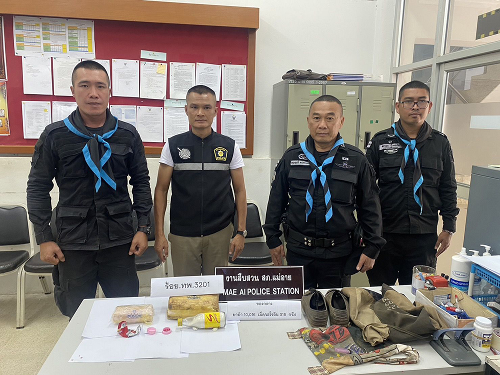 เปิดออกดูพบเป็นยาเสพติดให้โทษประเภทที่ 1 (ยาบ้า) ห้อหุ้มด้วยกระดาษเทียนไข ประทับตัวอักษร 999 จำนวน 1 แพ็ค แกะออกดูพบเป็นยาบ้า จำนวน 5 มัดๆ ละประมาณ 2,000 เม็ด รวมประมาณ 10,000 เม็ด และภายในกระเป๋าย่ามยังพบกระเป๋าใบเล็กอีก จำนวน 1 ใบ เปิดออกดูพบกระปุกครีม จำนวน 1 กระปุก ภายในมียาบ้า จำนวน 12 เม็ด และยาเสพติดให้โทษประเภทที่ 1 (เฮโรอีน) บรรจุอยู่ในขวดสปอนเซอร์ จำนวน 1 ขวด รวมขวดบรรจุหนัก 319 กรัม หน่วยจึงได้นำของกลางทั้งหมด ส่งมอบให้ พนักงานสอบสวนสถานีตำรวจภูธรแม่อาย จังหวัดเชียงใหม่ และ ดำเนินการสืบสวนขยายผล และดำเนินคดีตามกฏหมายต่อไป