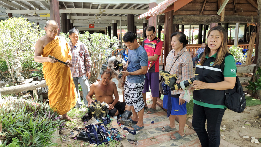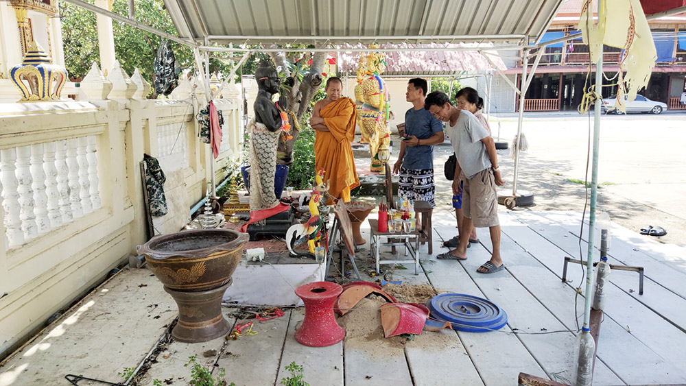 ทางนายมาโนช สุดสายตา อดีต ผู้อำนวยการโรงพยาบาลส่งเสริมสุขภาพตำบลศาลาขาว ซึ่งบ้านอยู่ฝั่งตรงข้ามวัดเล่าว่าช่วงประมาณ 5 ทุ่มตนได้ยินเสียงคนร้ายทุบสิ่งของเสียงดังตรงจุดเกิดเหตุจึงยืนดูที่ประตูรั้วแต่ไม่ได้ออกมาดูจากนั้นได้ยินเสียงรถจักรยานยนต์ขับออกไปทางวัดสามทองกระทั่งเช้าจึงทราบว่ารูปหล่อเหมือนองค์สมเด็จถูกคนร้ายทุบเสียหาย ตนและชาวบ้านรู้สึกเสียใจสะเทือนใจเนื่องจากองค์สมเด็จพระนเรศวรเป็นที่เคารพสักการะของชาวบ้าน 4 หมู่บ้าน 2 ตำบล และของคนไทยทั้งประเทศกลับมาถูกคนทำลาย