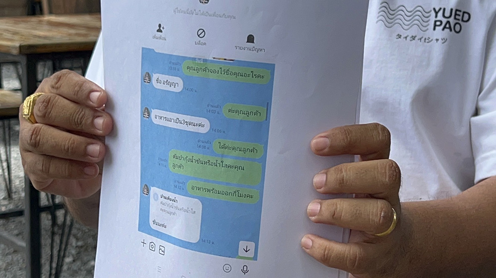 กระทั่งเมื่อถึงเวลานัดทางร้านก็ทำอาหารไว้ครบแล้ว แต่ทางลูกค้าที่นัดหมายไม่มา ตนเองจึงเอะใจว่าผจก.ร้านที่เป็นลูกน้องตนเองที่เข้าใหม่คุยกันผิดวันหรือป่าว ตนเองจึงให้ผู้จัดการร้านโทรกลับไปและตนเองก็โทรด้วยเช่นกันปรากฏว่าไม่สามารถติดต่อได้ ทักไลน์ไปก็ไม่ได้ จากนั้นตนเองจึงนำเบอร์ส่วนตัวแอดไลน์เบอร์โทรลูกค้าที่สั่งอาหารปรากฏว่าขึ้นภาพถ่ายโปรไฟล์เป็นชายที่มีรอยสักเต็มตัว ตนเองจึงคิดว่าไม่น่าใช่แล้ว จากนั้นตนเองจึงไล่เช็คบัญชีรายรับทางแอพพริเคชั่นธนาคารก็พบว่าไม่มีการโอนเงินค่าอาหาร5617บาท เข้ามาจึงมั่นใจว่าโดนหลอกแน่นอน ซึ่งส่วนที่ตนเองเสียไปคือการทำอาหารรอจำนวน7อย่าง3ชุด ส่วนอย่างอทื่นตนเองยังไม่ได้รับความเสียหาย ทั้งนี้ได้ไปแจ้งความไว้ที่สภ.สามโคกแล้ว