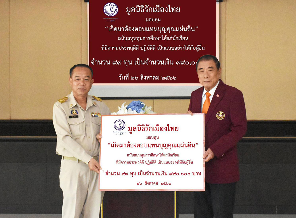 มูลนิธิรักเมืองไทย จัดพิธีมอบทุนการศึกษาผ่านระบบออนไลน์ ให้แก่โรงเรียนในความอุปถัมภ์ของมูลนิธิฯ จำนวน 37 โรงเรียน และโรงเรียนในสังกัด กองบัญชาการกองทัพไทยอีก 2 โรงเรียน ในชื่อทุน “เกิดมาต้องตอบแทนบุญคุณแผ่นดิน” เพื่อรำลึกถึงอดีตประธานกรรมการมูลนิธิรักเมืองไทย พลเอก เปรม ติณสูลานนท์ โดยทุนการศึกษาที่มอบในครั้งนี้ มอบให้แก่นักเรียนที่มีความประพฤติดี ปฏิบัติดี เพื่อเป็นการยกย่องบุคคลที่เป็นแบบอย่างที่ดีของโรงเรียน โดย พลเอก มงคล อัมพรพิสิฏฐ์ ประธานกรรมการมูลนิธิรักเมืองไทย เป็นประธานมอบทุนการศึกษาให้กับ นายศุภสิน ภูศรีโสม ผู้อำนวยการสำนักอำนวยการ (ผอ.สอ.) เป็นผู้แทนของสำนักงานคณะกรรมการการศึกษาขั้นพื้นฐาน (สพฐ.) เป็นผู้แทนรับมอบทุนการศึกษาจำนวน 99 ทุน จำนวนเงิน 990,000 บาท