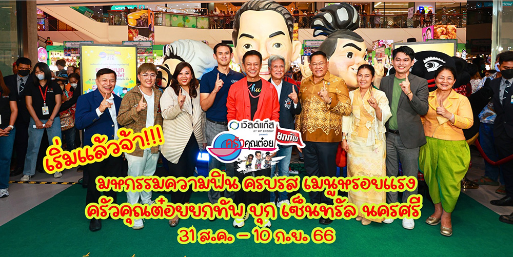มหกรรมความฟินสุดยิ่งใหญ่ มาถึงแล้ว กับงาน“ครัวคุณต๋อยยกทัพ บุก เซ็นทรัล นครศรี Presented by เวิลด์แก๊ส โดย WP Energy ”เหล่านักกิน อินฟลูสายรีวิว มาช้อป ชิม ชิลกันได้เลยงานนี้ได้รับเกียรติจากคุณ อภินันท์ เผือกผ่อง ผู้ว่าราชการจ.นครศรีธรรมราชและหน่วยงานทุกภาคส่วน ร่วมเปิดงานอย่างเป็นทางการพร้อมครอบครัวครัวคุณต๋อยนำโดยอาต๋อยไตรภพ ลิมปพัทธ์ เอ๊าะ-กรีติ โก๊ะตี๋อารามบอยคุณก่อเกียรติ ลิมปพัทธ์และคุณตูนพัทธยศ ลิมปพัทธ์เพลิดเพลินกับร้านเด็ดตัวจริงมืออาชีพ 60 ร้านค้า คัดสรรวัตถุดิบคุณภาพดี ปรุงสด เสิร์ฟใหม่อิ่มอร่อยกับเมนูหลากหลายสไตล์ กินได้ทุกวัยมารวมไว้ที่งานนี้ ทุกร้านการันตีความอร่อยจากรายการครัวคุณต๋อยโซนเด็ดห้ามพลาด “ครัวคุณต๋อย Selected” ดีลร้านเด็ด เน้นเมนูหรอยแรง ใครได้อีท…ต้องกรี้ดแน่นอนล้านแปดแดดเดียว: หลากหลายปลาทะเลแดดเดียว ส่งตรงจากปราณบุรี และอาหารทะเลตากแห้ง สด สะอาด ไร้สารเคมีข้าวขาหมูอาโป: ขาหมูสูตรต้นตำรับ เนื้อแน่น หนังนุ่ม รสเข้มข้น อร่อยกลมกล่อม สวรรค์ของคนรักขาหมูEnjoy lasagna: ลาซานญ่า เมนูอิตาเลียนยอดฮิต ไส้แน่น ชีสเยิ้มTeyaki: เซมเบ้ ข้าวเกรียบญี่ปุ่นยอดฮิต ทำกันใหม่ ๆ แผ่นต่อแผ่น ให้คุณได้สัมผัสความอร่อย