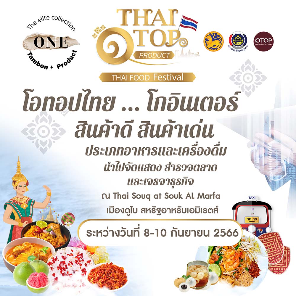 กรมพัฒนาชุมชน นำทัพผู้ประกอบการผลิตภัณฑ์ OTOP กลุ่มปรับตัวสู่การพัฒนา(Quadrant D) ให้มีคุณภาพมาตรฐาน ประเภทอาหารและเครื่องดื่มกว่า 96 ผลิตภัณฑ์ “The Elite Collection One Tambon One Product” รุกทดสอบตลาดในประเทศสหรัฐอาหรับเอมิเรตส์ ภายใต้คอนเซ็ปต์ “Thai OTOP Product – Thai Food Festival” ระหว่างวันที่ 8-10 กันยายน 2566 ณ Souk Al Marfa ประเทศสหรัฐอาหรับเอมิเรตส์