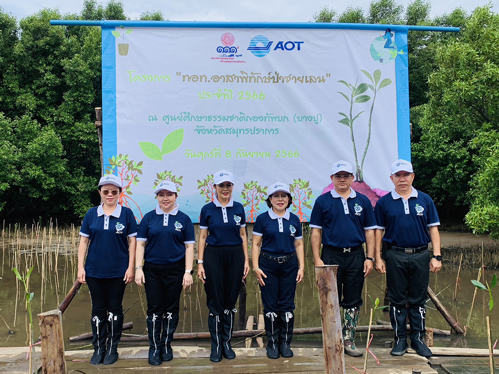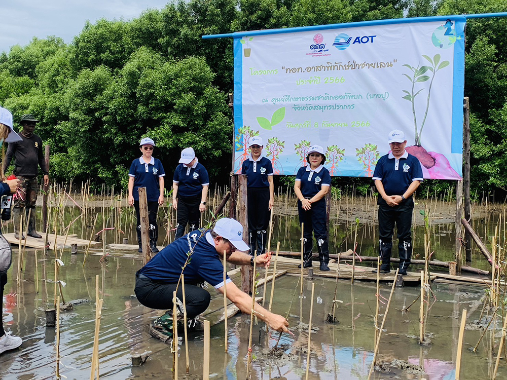 เมื่อเวลา 10.00 น.วันที่ 8 ก.ย.2566 ที่ศูนย์ศึกษาธรรมชาติกองทัพบก (บางปู) ถนนสุขุมวิท ตำบลบางปูใหม่ อำเภอเมืองฯ จังหวัดสมุทรปราการ บริษัท ท่าอากาศยานไทย จำกัด (มหาชน) (AOT)จัดกิจกรรมโครงการ “อาสาพิทักษ์ป่าชายเลน” ประจำปี 2566 โดยมี นายชัยพจน์ จรูญพงศ์ รองผู้ว่าราชการจังหวัดสมุทรปราการ น.ส.ปัญญารัตน์ ทองจิตติ ผู้เชี่ยวชาญ 11 บริษัท ท่าอากาศยานไทย จำกัด (มหาชน) นำผู้บริหารและพนักงาน AOT และเยาวชนจากโรงเรียนดอนเมืองทหารอากาศบำรุง ซึ่งเป็นโรงเรียนโดยรอบสำนักงานใหญ่AOTและท่าอากาศยานดอนเมือง และโรงเรียนพูลเจริญวิทยาคมจังหวัดสมุทรปราการ ซึ่งเป็นโรงเรียนโดยรอบท่าอากาศยานสุวรรณภูมิ ร่วมปลูกต้นโกงกางจำนวน 9,999 ต้น บนพื้นที่ 2 ไร่ เพื่อฟื้นฟูสภาพป่าชายเลนของประเทศ ป้องกันการกัดเซาะชายฝั่งและอนุรักษ์สิ่งแวดล้อม ตลอดจนส่งเสริมค่านิยมการรักษาระบบนิเวศชายฝั่งและการทำกิจกรรมเพื่อสร้างความสัมพันธ์ที่ดีกับชุมชน