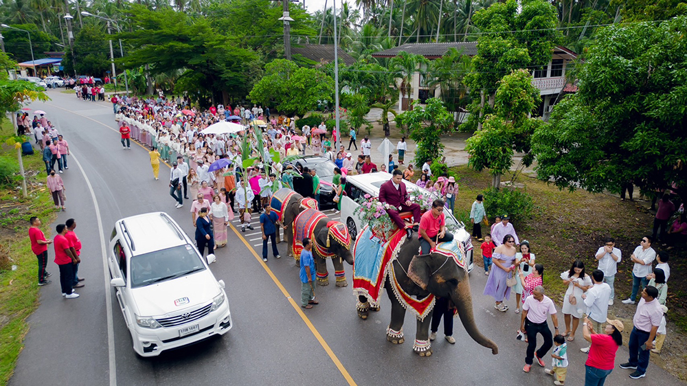 ฮือฮา…!! สุดอลังการ พิธีแห่ขันหมากงานมงคลสมรส เจ้าบ่าว ลูกชายนายกห้วยยาง นั่งหลังช้าง สู่ขอเจ้าสาว ลูกสาวนายกแม่รำพึง ท่ามกลางแขกร่วมแสดงความยินดีจำนวนมาก