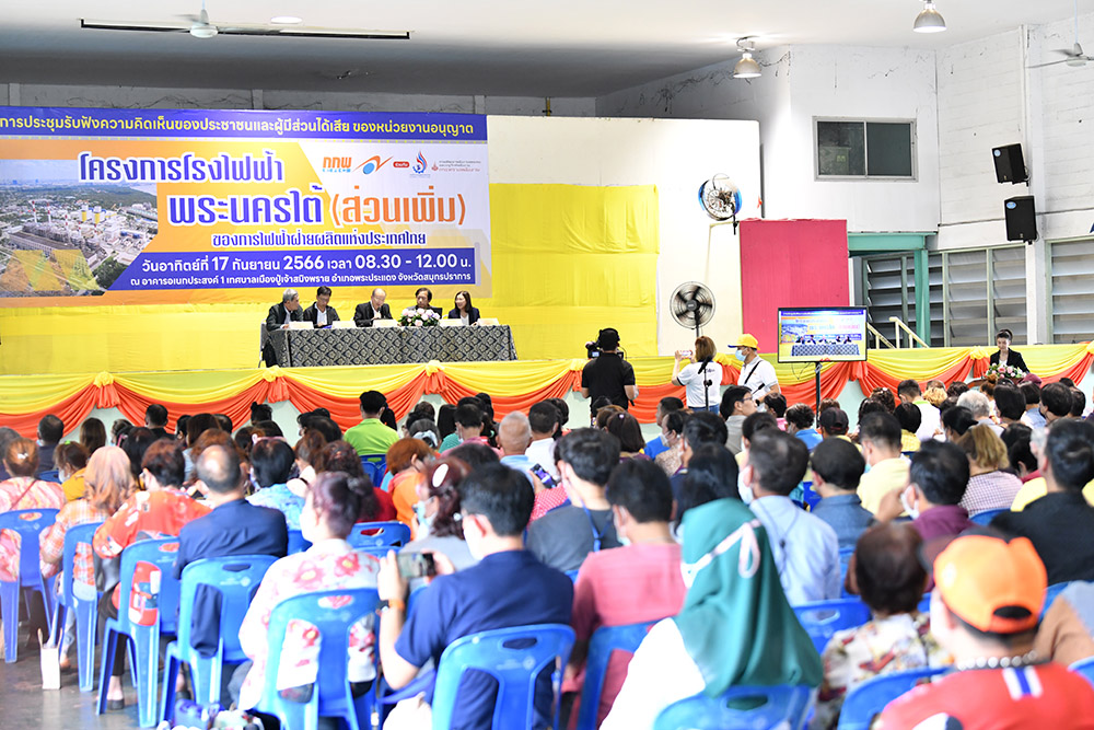 *****เมื่อเวลา 9.00น.วันที่ 17 ก.ย.2566 นายสมศักดิ์ แก้วเสนา นายอำเภอเมืองสมุทรปราการ เป็นประธานเปิดการประชุมรับฟังความคิดเห็นของประชาชนและผู้มีส่วนได้เสียของหน่วยงานอนุญาต โครงการโรงไฟฟ้าพระนครใต้ (ส่วนเพิ่ม) ของ กฟผ. เพื่อรวบรวมความคิดเห็นของประชาชนนำไปประกอบการพิจารณาอนุญาต พร้อมด้วย ผู้แทนสำนักงานงาน กกพ. คณะกรรมการรับฟังความคิดเห็นฯ ประชาชนในพื้นที่ ส่วนราชการ องค์กรเอกชน สถาบันการศึกษา สื่อมวลชน และประชาชนที่สนใจ ร่วมงานเกือบ 500 คน มีผู้เข้าร่วมประชุมแบบออนไลน์ และผู้แสดงความคิดเห็นด้วยวาจา ร่วมด้วย ณ เทศบาลเมืองปู่เจ้าสมิงพราย อำเภอพระประแดง จังหวัดสมุทรปราการ เมื่อวันที่ 17 กันยายน 2566