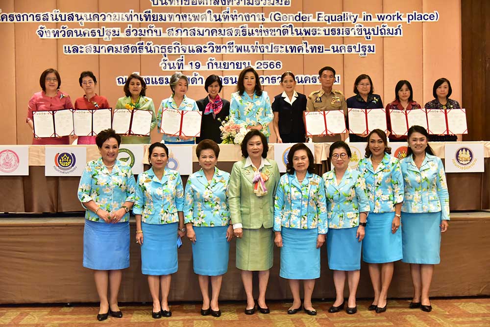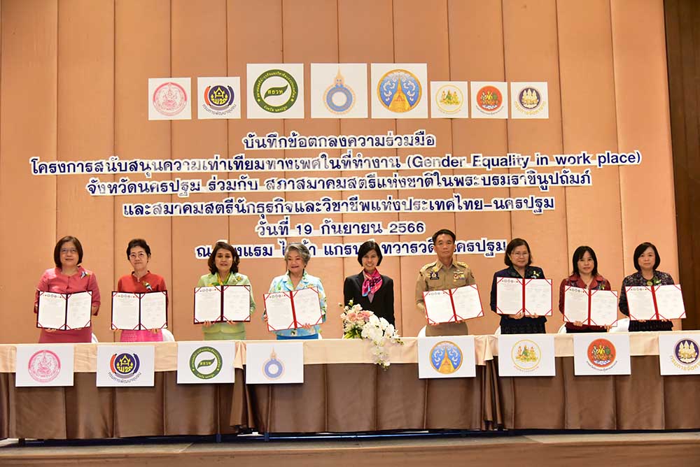 วันที่ 19 กันยายน 2566 โรงแรมไมด้า แกรนด์ ทวารวดี อำเภอเมืองนครปฐม จังหวัดนครปฐม นายยงยุทธ สวนทอง รองผู้ว่าราชการจังหวัดนครปฐม เป็นประธานในพิธีลงนามบันทึกข้อตกลงความร่วมมือโครงการสนับสนุนความเท่าเทียมทางเพศ ในที่ทำงาน โดยมี นางสาวสุกัญญา ประจวบเหมาะ ประธานสภาสมาคมสตรีแห่งชาติในพระบรมราชินูปถัมภ์ ,อธิบดีกรมกิจการสตรีและสถาบันครอบครัว ,นางวราภรณ์ เจริญศิริโชติ นายกเหล่ากาชาดจังหวัด ,นางสาวณัฏฐ์ปภาณ จันทร์ละมูล นายกสมาคมสตรีนักธุรกิจและวิชาชีพแห่งประเทศไทย – นครปฐม/กรรมการอำนวยการสภาสมาคมสตรีแห่งชาติ ในพระบรมราชินูปถัมภ์ ,นางสาวยุพิน มูลจันทะ แรงงานจังหวัด ,ผู้แทน สนง.สวัสดิการและคุ้มครองแรงงานจังหวัด ,นางอัธยา อ่ำหนองโพ จัดหางานจังหวัด ,นางสาวทิพวรรณ ไชยูปถัมภ์ พัฒนาการจังหวัด และนางสาวศิริพร โรจนสุกาญจน พัฒนาสังคมและความมั่นคงของมนุษย์จังหวัด ร่วมพิธีลงนามในครั้งนี้