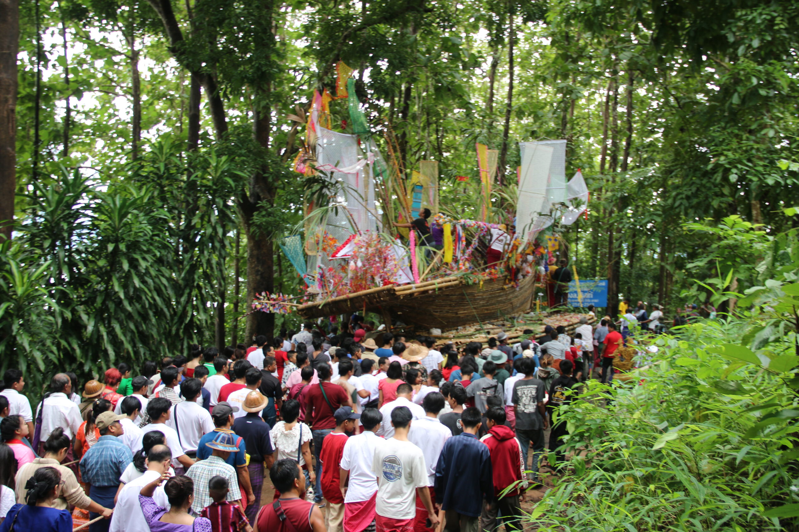 เมื่อถึงเช้าวันแรม 1 ค่ำ ชาวบ้านมารวมตัวกันตั้งเป็นขบวนแห่ มีปล่อยโคมลอยเล็กใหญ่ที่ช่วยกันทำขึ้นมา ประกอบการร้องรำทำเพลงอย่างสนุกสนาน จากนั้นชาวบ้านทั้งหมดจะช่วยกันลากเรือไปปล่อยกลางน้ำบริเวณจุดบรรจบของแม่น้ำสามสาย ได้แก่ ซองกาเลีย รันตี และบิคลี่ ที่เรียกกันว่า “สามสบ” หรือ “สามประสบ” นั่นเอง