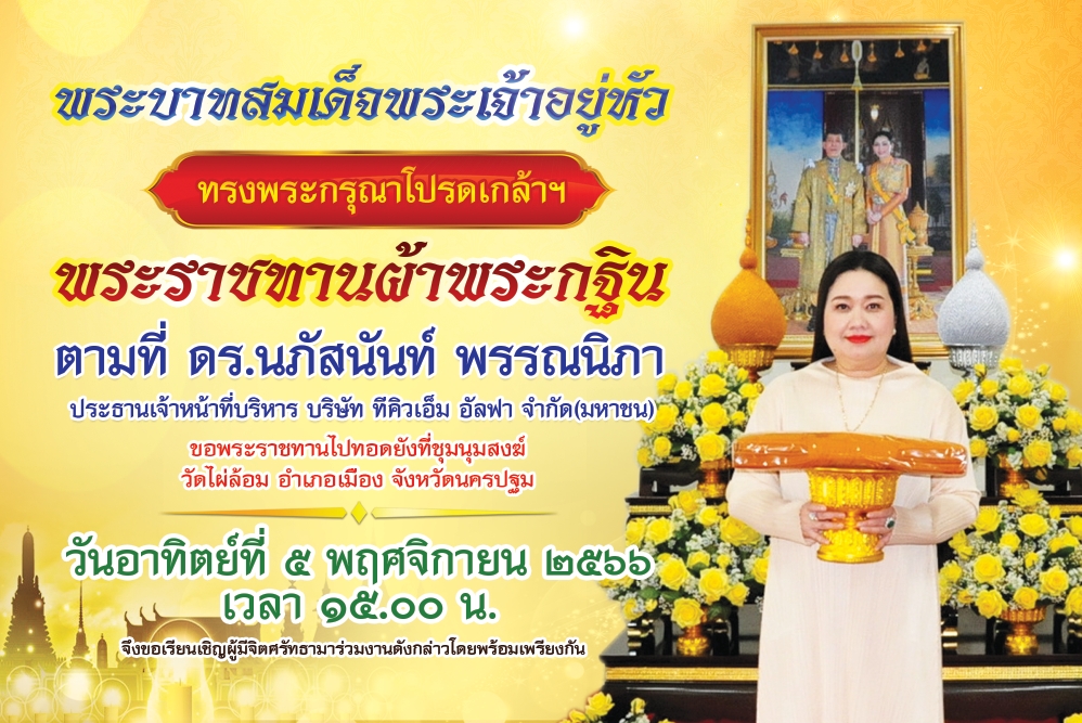 พระบาทสมเด็จพระเจ้าอยู่หัว ทรงพระกรุณาโปรดเกล้าฯ พระราชทานผ้าพระกฐินให้ บมจ.ทีคิวเอ็ม อัลฟา และ บริษัทฯ ในเครือ ทั้ง 14 บริษัทฯ ตามที่ ดร.นภัสนันท์ พรรณนิภา ประธานเจ้าหน้าที่บริหาร บริษัท ทีคิวเอ็ม อัลฟา จำกัด (มหาชน) ขอพระราชทานเพื่อน้อมนำไปถวายขอพระราชทานไปทอดยังที่ ชุมนุมสงฆ์ วัดไผ่ล้อม อำเภอเมือง จังหวัดนครปฐม เพื่อเป็นการทำนุบำรุงพระพุทธศาสนา ในวันอาทิตย์ที่ 5 พฤศจิกายน 2566 เวลา 15.00 น. จึงขอเรียนเชิญผู้มีจิตศรัทธามาร่วมงานดังกล่าวโดยพร้อมเพียงกัน