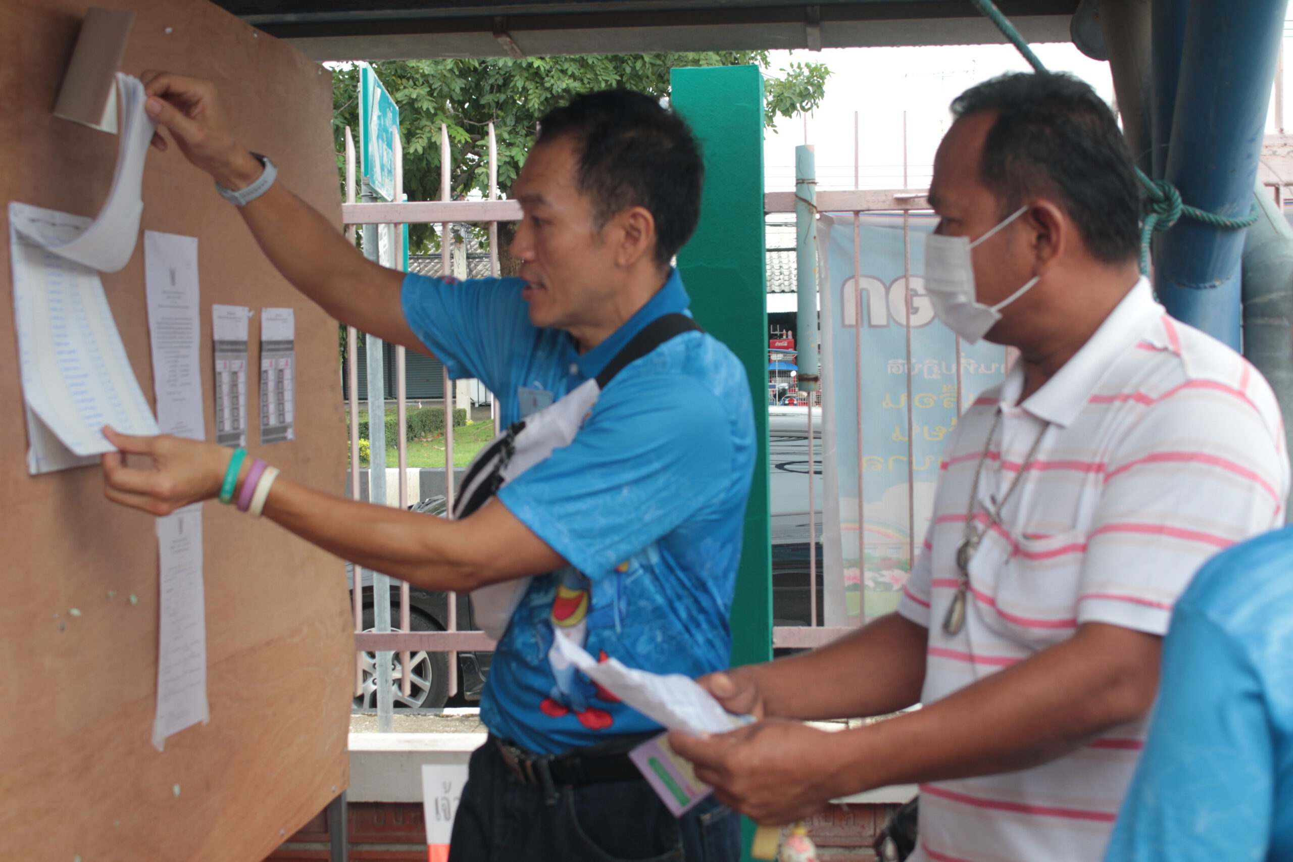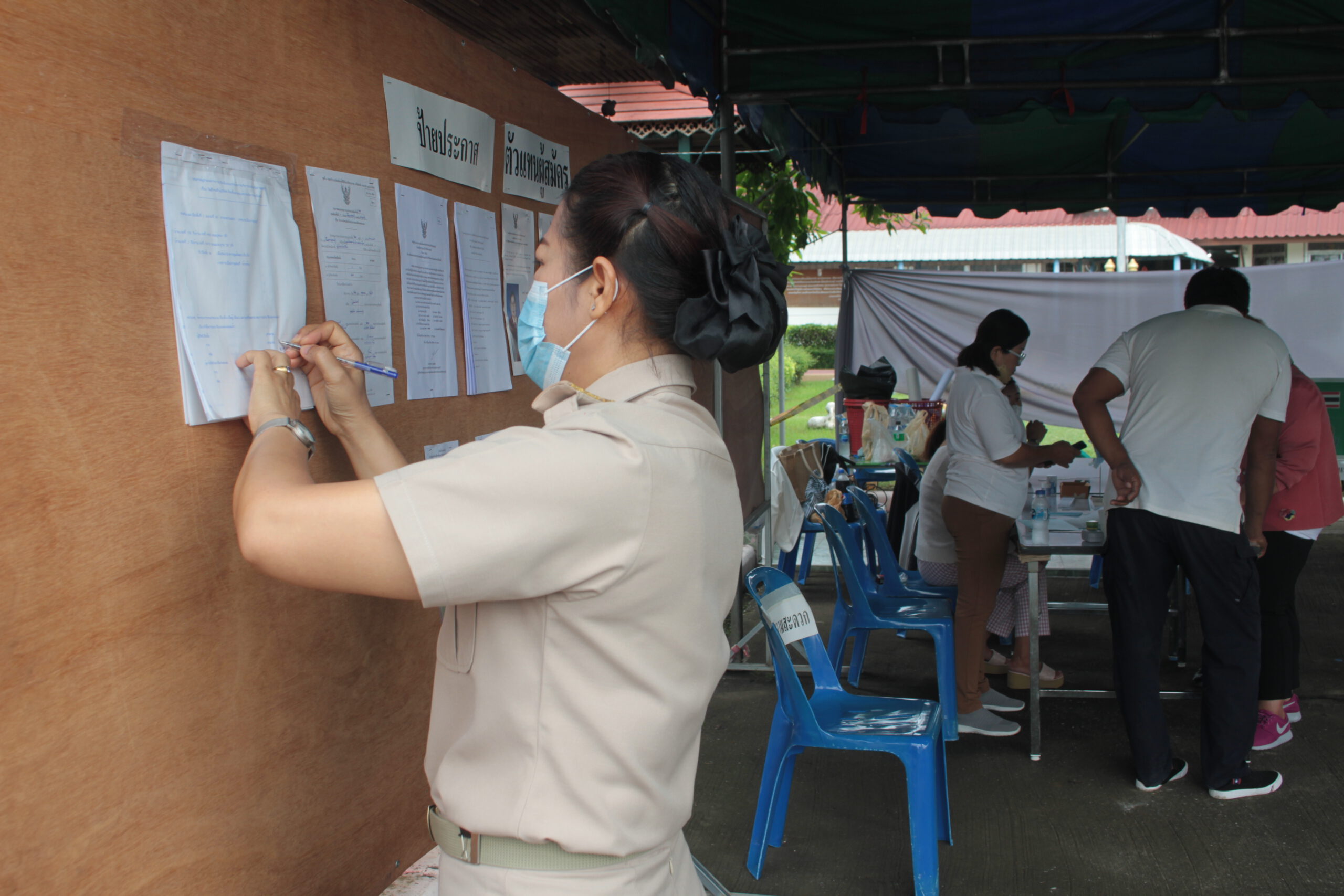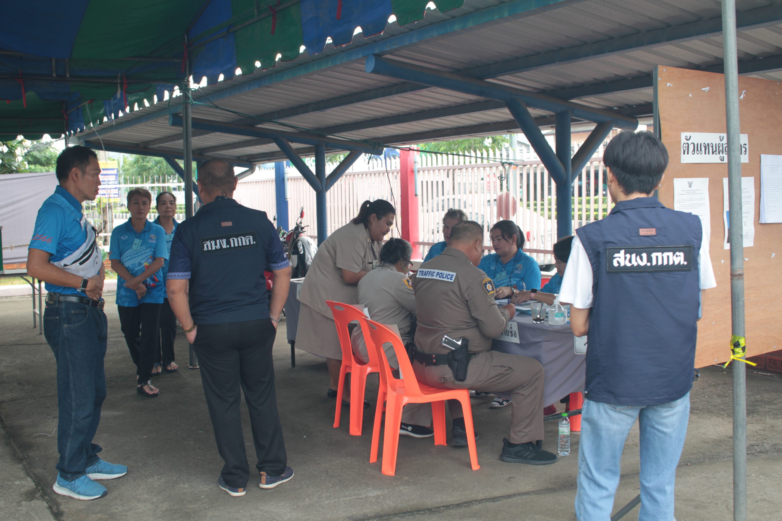 ร้อยตำรวจเอกพงศ์บัณฑิต ปิ่นสุวรรณ์ ผู้อำนวยการการเลือกตั้งประจำจังหวัดกาญจนบุรี นายนิรันดร์ บุญราช หัวหน้ากลุ่มงานจัดการเลือกตั้งและการมีส่วนร่วม ได้เดินทางลงพื้นที่หน่วยลงคะแนนของศูนย์เด็กเด็ก ทั้ง 2 หน่วยได้เวลาเปิดหีบลงคะแนนมีประชาชนเริ่มทยอยใช้สิทธิ์กันไม่ขาดสาย มีทั้งกลุ่มวัยรุ่นอายุเพียง 18 ปี ที่เพิ่งมีสิทธิ์ลงคะแนนครั้งแรกก็ไปใช้สิทธิ์กัน รวมไปจนถึงผู้สูงอายุ ซึ่งในหน่วยเลือกตั้งที่ 21 ศูนย์เด็กเล็กแห่งนี้ ร้อยโททศพล ไชยโกมินทร์ ผู้ว่าราชการจังหวัดกาญจนบุรี ก็จะเดินทางไปใช้สิทธิ์หน่วยนี้ด้วยเช่นกัน โดยได้รับแจ้งว่าในช่วงเช้าทางผู้ว่าฯ ติดภารกิจ จะเดินทางไปใช้สิทธิ์ในช่วงบ่ายแทน ส่วนผู้สมัครทั้ง 2 ท่าน ประกอบด้วย สำหรับผู้สมัครรับเลือกนายก อบจ.กาญจนบุรี มี 2 คน ประกอบด้วย เบอร์ 1 นายสุกวี แสงเป่า อดีตประธานสภาทนายความจังหวัดกาญจนบุรี อดีตผู้สมัคร สส.กาญจนบุรี พรรคอนาคตใหม่ และพรรคก้าวไกล จะไปใช้สิทธิ์ลงคะแนนในพื้นที่อำเภอท่าม่วง และเบอร์ 2 นายแพทย์ประวัติ หรือหมอหวัด กิจธรรมกูลนิจ ผู้อำนวยการโรงพยาบาลด่านมะขามเตี้ย อดีตรองนายแพทย์สาธารณสุขจังหวัดกาญจนบุรี ที่ลงในนามทีม “พลังกาญจน์” ไปใช้สิทธิ์ลงคะแนนในอำเภอด่านมะขามเตี้ย