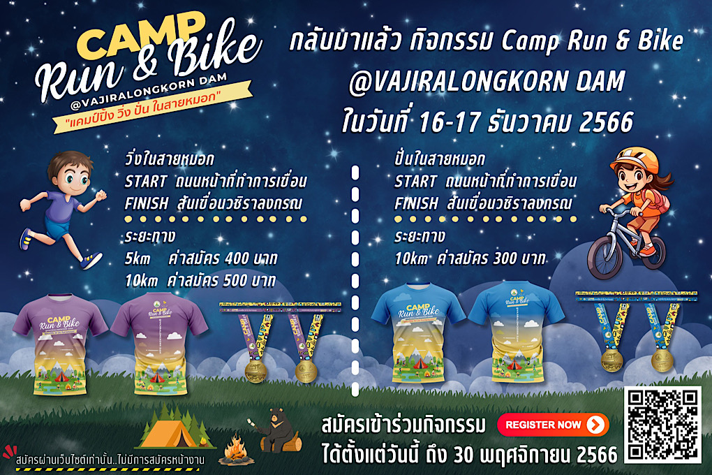กาญจนบุรี เทศบาลตำบลทองผาภูมิร่วมกับเขื่อนวชิราลงกรณ เชิญชวนสายนักวิ่ง สายนักปั่นและสายแคมป์ปิ้งร่วมกิจกรรม Run&Bike “แคมป์ปิ้ง วิ่ง ปั่นในสายหมอก” ณ เขื่อนวชิราลงกรณ