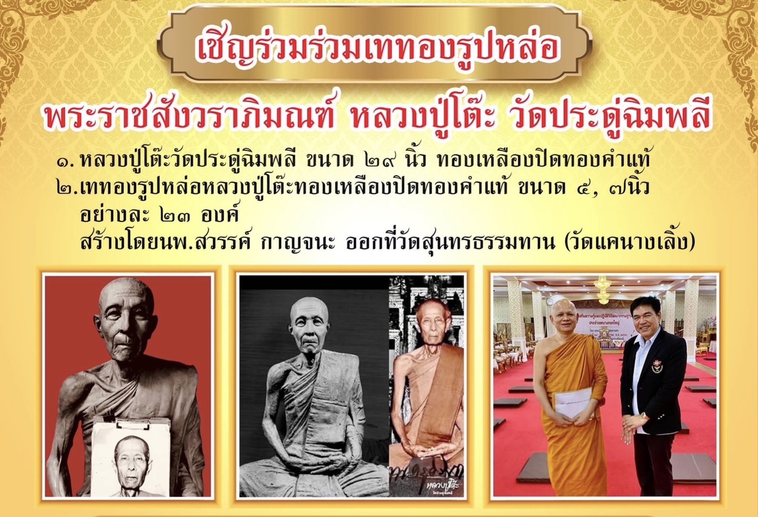 นพ.สวรรค์ กาญจนะ อดีต ผอ.รพ. เบตง เปิดเผยว่า ขอเชิญร่วมบุญ สืบทอดพระพุทธศาสนา กำหนดฤกษ์เททอง พระราชสังวราภิมณฑ์ หลวงปู่โต๊ะ วัดประดู่ฉิมพลี ขนาด29นิ้ว ทองเหลืองปิดทองคำแท้ จำนวนสององค์
