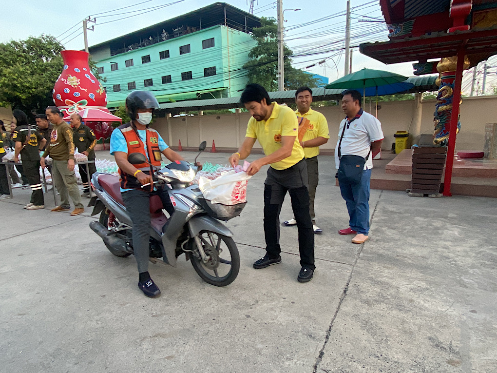 *****เมื่อเวลา 06.00น.วันที่ 5 ธันวาคม 66 ที่สำนักงานใหญ่ มูลนิร่วมกตัญญู ต.บางพลีใหญ่ อ.บางพลี จ.สมุทรปราการ นายบิณฑ์ และนายเอกพันธ์ บรรลือฤทธิ์ พร้อมด้วย น.ส.สกาวรัตน์ สมสกุลรุ่งเรือง เลขาธิการมูลนิธิร่วมกตัญญู และเจ้าหน้าที่อาสาสมัครมูลนิธิร่วมกตัญญู จัดกิจกรรม ทำความดีตามรอยพ่อหลวง รัชกาลที่ 9 เนื่องในวันพ่อแห่งชาติ 5 ธันวาคม 66 โดยมีการมอบเงินขวัญถุงให้กับเหล่าบรรดาคนขับรถจักรยานยนต์รับจ้างในพื้นที่บางพลีและใกล้เคียง รวม 999 คัน คันละ 500 บาท นอกจากนั้นยังมีการแจกไข่ไก่คันละแผง ผ้าห่ม และเครื่องดื่มคอมมานโดอีกจำนวนหนึ่ง ให้กับคนขับรถจักรยานยนต์รับจ้างในครั้งนี้อีกด้วย บรรยากาศเต็มไปด้วยรอยยิ้มทั้งผู้ให้และผู้รับเป็นอย่างมาก ซึ่งมีคนขับวินจักรยานยนต์รับจ้างมาจอดต่อคิวเพื่อรอรับของขวัญวันพ่อในครั้งนี้กันตั้งแต่ตีสี่ที่ผ่านมา โดยการดูแลและจัดระเบียบด้านการจราจรจากเจ้าหน้าที่ตำรวจจราจรของ สภ.บางพลี อย่างใกล้ชิดเพื่อป้องกันอุบัติเหตุและการกีดขวางการจราจร