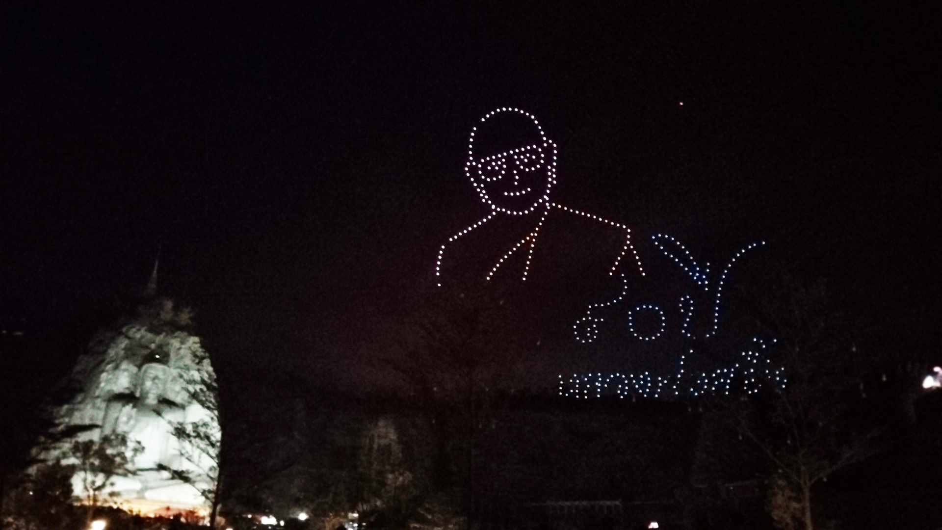 หลังเสร็จสิ้นพิธีพิธียกพระเกตุมาลาพระพุทธปุษยคีรีศรีสุวรรณภูมิ ได้มีโดรน 400 ลำ บินแปรอักษรบนท้องฟ้า เป็นรูปพระพุทธปุษยคีรีศรีสุวรรณภูมิ และแหล่งท่องเที่ยวต่างๆ ที่หน้าผาเขามังกรบินเป็นครั้งแรกของจังหวัดสุพรรณบุรี สร้างความตื่นเต้นและประทับใจแก่ผู้เข้าร่วมพิธีครั้งนี้ และแจกวัตถุมงคล ผ้ายันต์ ปฏิทินปีใหม่ และข้าวสาร ให้กับผู้ที่มาร่วมพิธีเป็นของขวัญปีใหม่