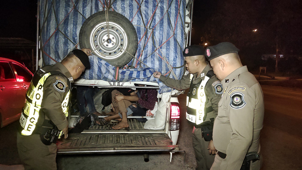 สุพรรณบุรี ทางหลวงศรีประจันต์จับกระบะดัดแปลงเป็นอุโมงขนต่างด้าว2ราย25คนมีคนโทรศัพท์ขอเคลียร์