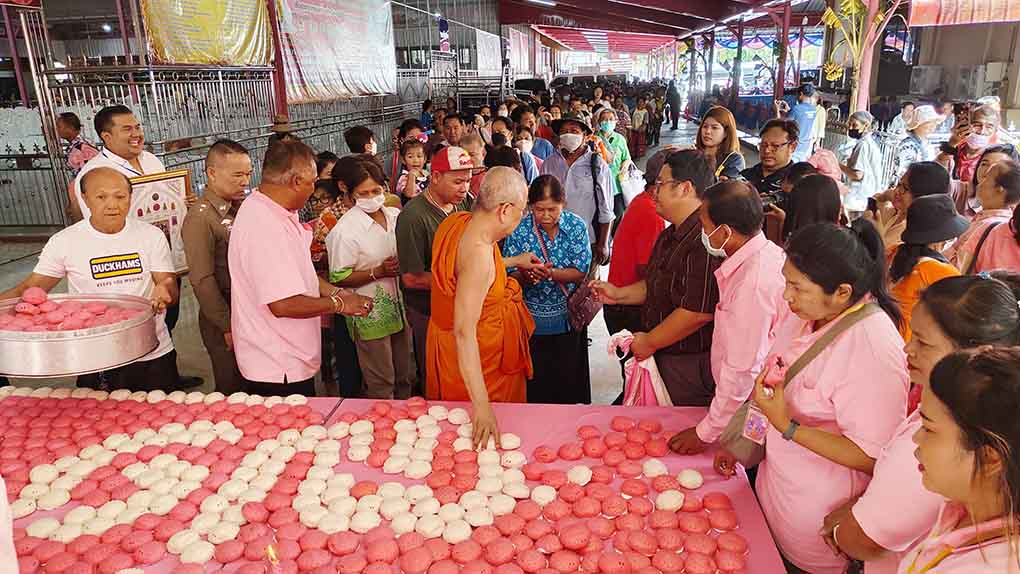 หลังเสร็จสิ้นพิธีสงฆ์ คณะศิษยานุศิษย์ได้นำเค้กสีชมพูและซาลาเปามงคล จำนวน 2,071 ลูก มีทั้งสีขาวและสีชมพูซึ่งเป็นสีประจำวันเกิดของหลวงพ่อวิชัย ใจดี มาถวายให้หลวงพ่อวิชัย ใจดี แจกชาวบ้าน ก่อนแจกหลวงพ่อวิชัยได้อธิษฐานจิต เมตตา เพื่อความเป็นสิริมงคล และจุดเทียน ตัดเค้กที่ลูกศิษย์นำมาถวาย พร้อมกับแจกเค้กให้บรรดาศิษยานุศิษย์ และได้แจกซาลาเปามงคล ให้กับชาวบ้านที่มาเข้าแถวรอรับแจกคิวยาวเหยียด ทำเอาซาลาเปามงคลหมดเกลี้ยงภายในไม่ถึง 20 นาที ชาวบ้านเชื่อว่าเป็นซาลาเปามงคล รับประทานแล้วจะมีสุขภาพร่างกายแข็งแรง เป็นมงคลต่อชีวิต และมีโชคลาภ