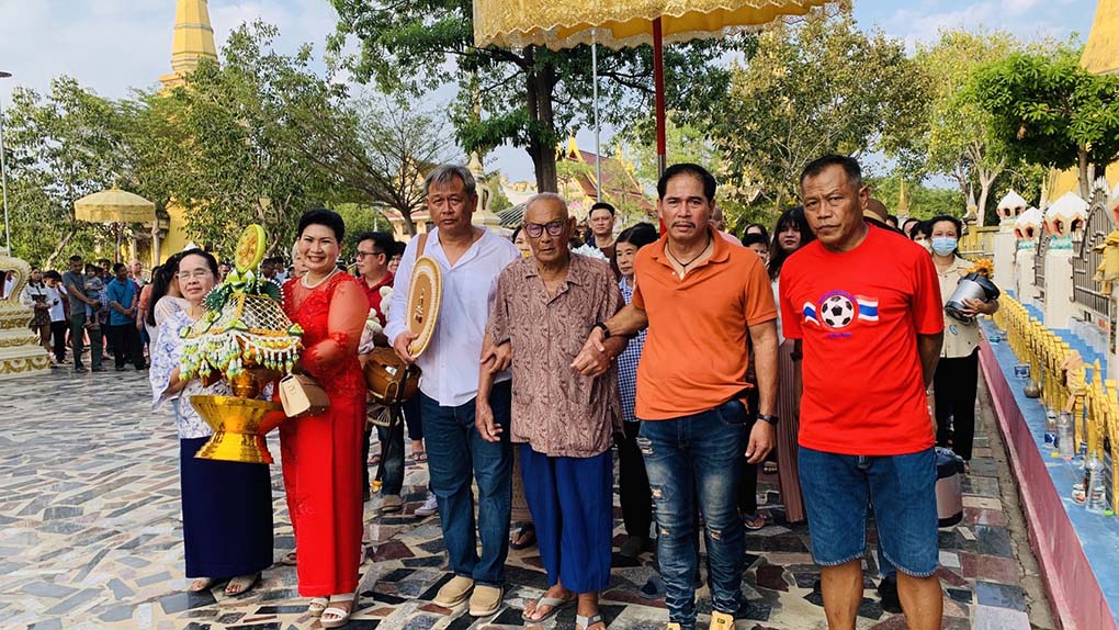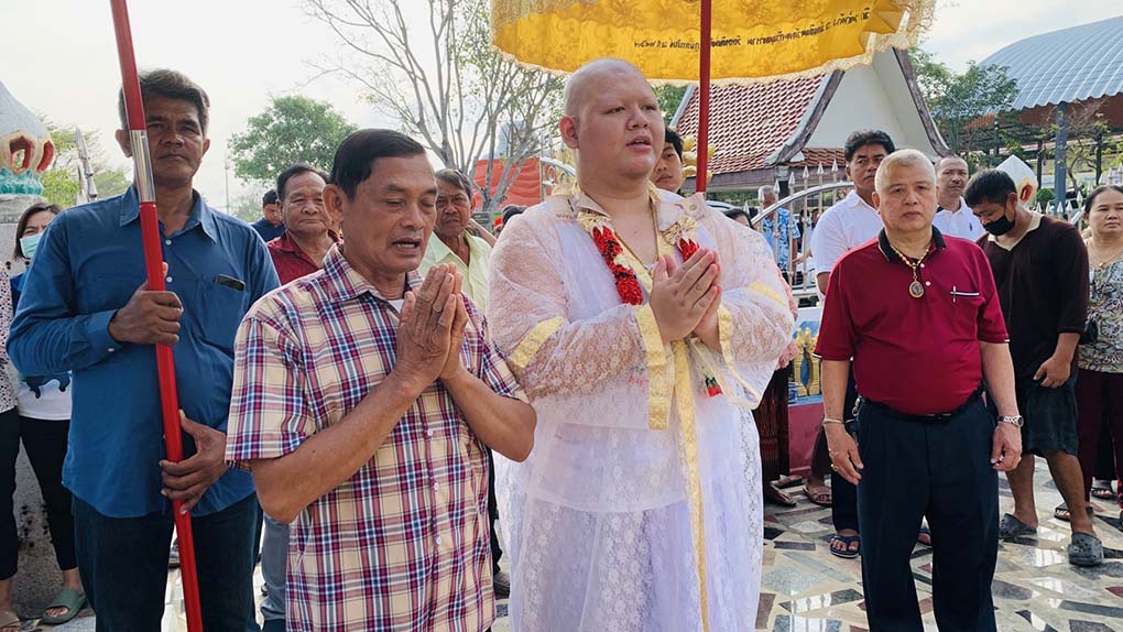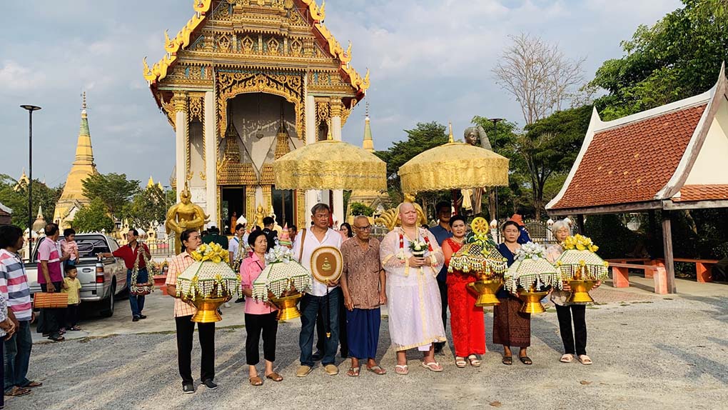 ญาติมิตรร่วมขบวนแห่รอบพระอุโบสถ วัดบ่อตะกั่ว พุทธาราม อ.นครขัยศรี จ.นครปฐม ก่อนเข้าพิธีบรรพชาผู้สื่อข่าวรายงานว่า 09.00 น. 4 ก.พ. 67 ที่พระอุโบสถ์ วัดบ่อตะกั่วพุทธาราม อ.นครชัยศรี จ.นครปฐม