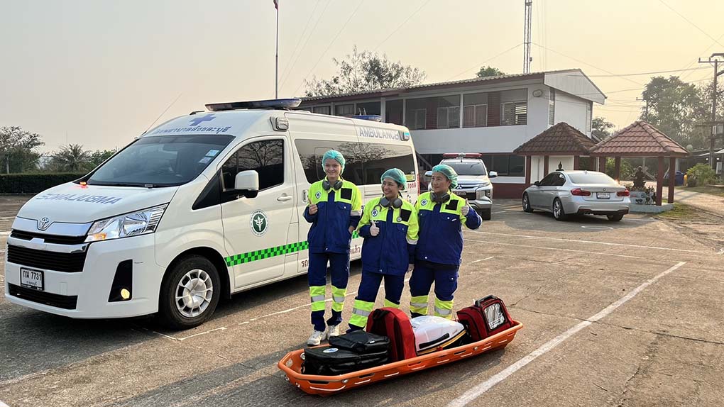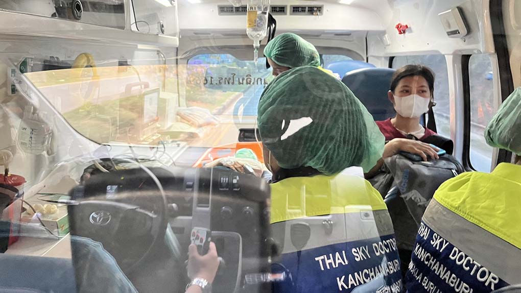 เพื่อนำตัวส่งโรงพยาบาลสังขละบุรี ซึ่งระหว่างทางได้มีการเช็คความดันโลหิตของผู้ป่วย พร้อมทั้งให้น้ำเกลือ และประสานข้อมูลกับทีมแพทย์ที่โรงพยาบาลพหลพลพยุหเสนาผ่านระบบ Telemedicine เป็นระยะเพื่อให้แพทย์ให้คำแนะนำและได้คอยสังเกตอาการ