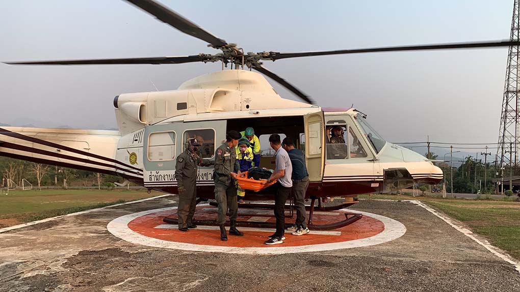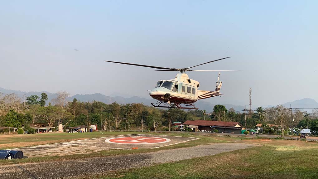 ต่อมาในเวลา 16.20 น เฮลิคอปเตอร์จากกองบินตำรวจ สำนักงานตำรวจแห่งชาติ ( กองกำกับการตำรวจตระเวนชายแดนที่ 13 ค่ายพระพุทธยอดฟ้าจุฬาโลก (ตชด.13) จังหวัดกาญจนบุรี ได้บินมายังสนาม ฮ กองร้อย ตชด.134 (สังขละบุรี) เพื่อรับทีมแพทย์ฉุกเฉินทางอากาศ(SKY DOCTOR) โรงพยาบาลสังขละบุรี โดยมี แพทย์หญิงอรกัญญา ฉิมพาลี วิสัญญีแพทย์โรงพยาบาลพหลพลพยุหเสนา (ขณะเดินทางมาเตรียมงานรับนายแพทย์ชลน่าน ศรีแก้ว รัฐมนตรีกระทรวงสาธารณสุข) นำทีม เดินทางเข้าไปช่วยลำเลียงผู้ป่วย โดยเฮลิคอปเตอร์ใช้เวลาในการเดินทาง15นาที ก่อนจะลงจอดยังสนาม ฮ.ศูนย์การเรียนท่านผู้หญิงมณีรัตน์ บุญนาค (บ้านปางสนุก) ก่อนที่ทีมแพทย์จะเดินทางไปยังสุขศาลาพระราชทานบ้านปางสนุก เพื่อดูอาการผู้ป่วยในเบื้องต้นพร้อมทำการเคลื่อนย้ายผู้ป่วยมาขึ้นเฮลิคอปเตอร์
