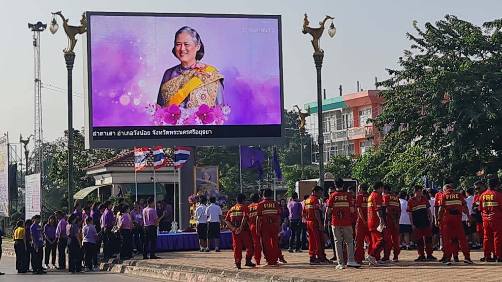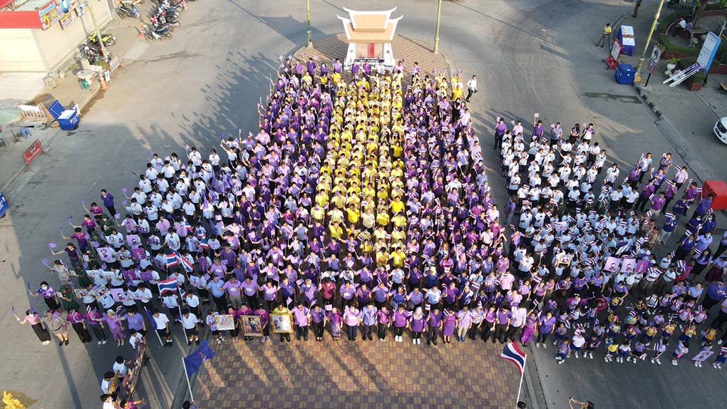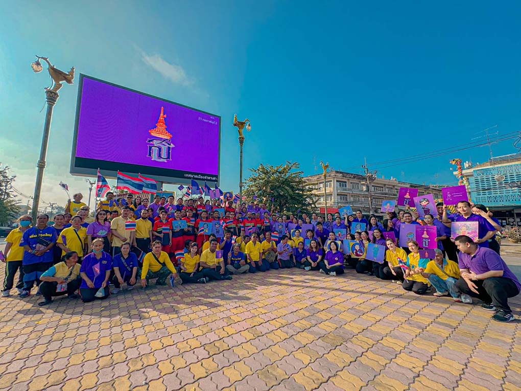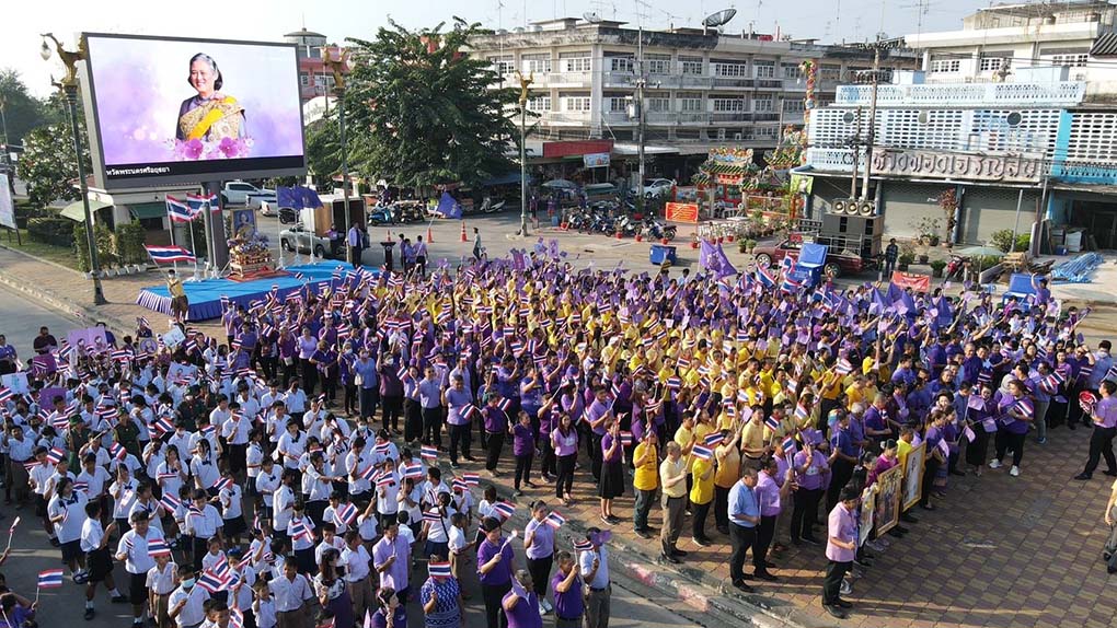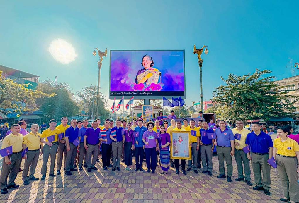 อยุธยา พสกนิกรพร้อมใจสวมเสื้อสีม่วง ถือป้ายเรารักพระเทพฯ ร้องเพลงสรรเสริญ พระบารมี ดังกึกก้อง ที่ ตลาดวังน้อย อยุธยา
