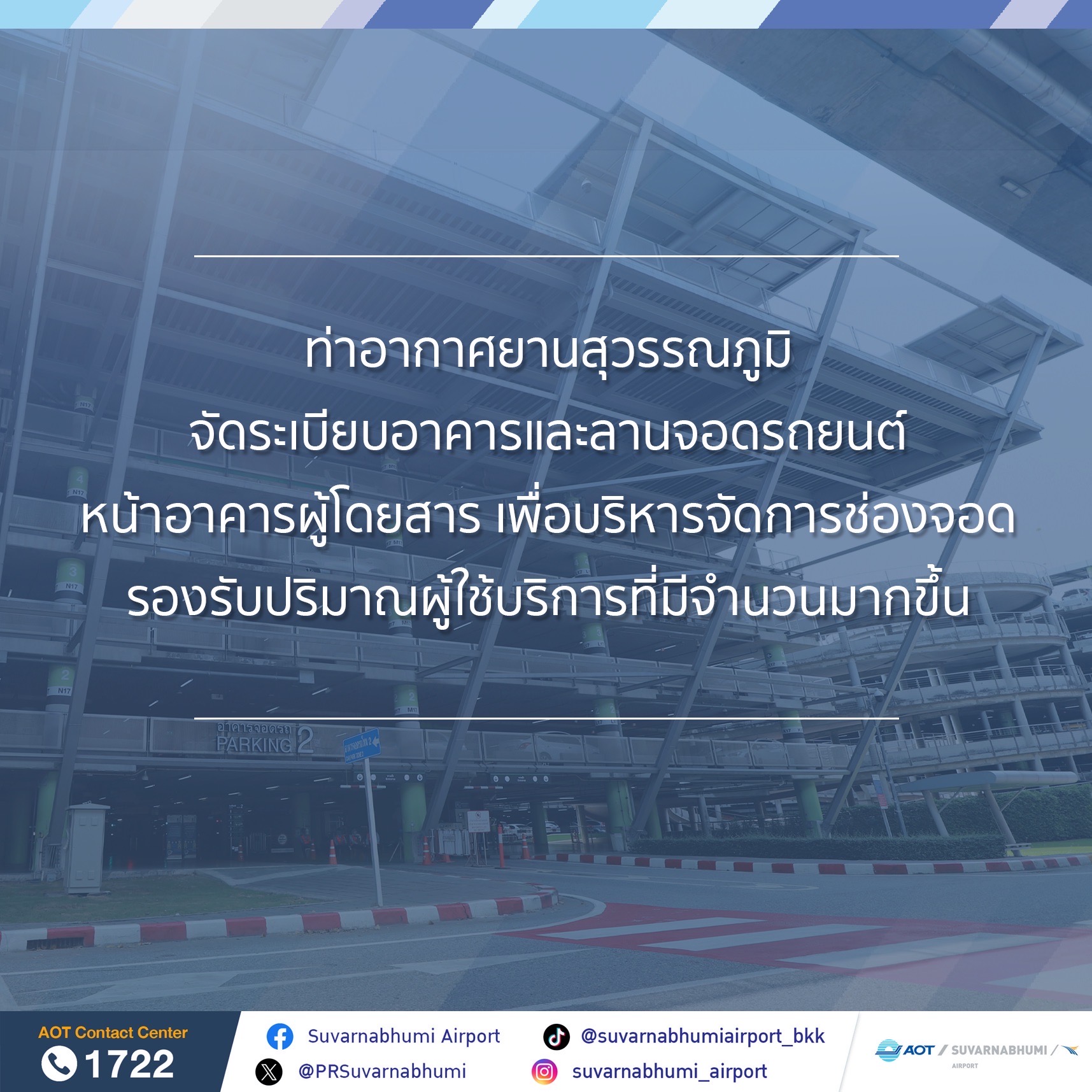 *****สืบเนื่องจากอุตสาหกรรมการบินและภาคการท่องเที่ยวไทยกลับมาฟื้นตัว ส่งผลให้จำนวนเที่ยวบินและผู้โดยสาร ณ ท่าอากาศยานสุวรรณภูมิ (ทสภ.) มีจำนวนมากขึ้นตามลำดับ และคาดการณ์ว่าจะเพิ่มมากขึ้นอย่างต่อเนื่อง เพื่อรองรับปริมาณผู้ใช้บริการให้มีประสิทธิภาพมากยิ่งขึ้น ทสภ.ได้จัดระเบียบอาคารและลานจอดรถยนต์หน้าอาคารผู้โดยสาร โดยกำหนดแนวทางปฏิบัติเมื่อตรวจสอบพบรถที่จอดนานกว่า 6 เดือน จะดำเนินการเคลื่อนย้ายรถดังกล่าวไปยังลานจอดรถระยะยาวโซน C ตรงข้ามศูนย์การขนส่งสาธารณะ ทสภ. (Bus Terminal) ทั้งนี้ เพื่อบริหารจัดการช่องจอดและลดความคับคั่งในพื้นที่จอดรถโดยคำนึงถึงผู้ใช้บริการเป็นสำคัญ