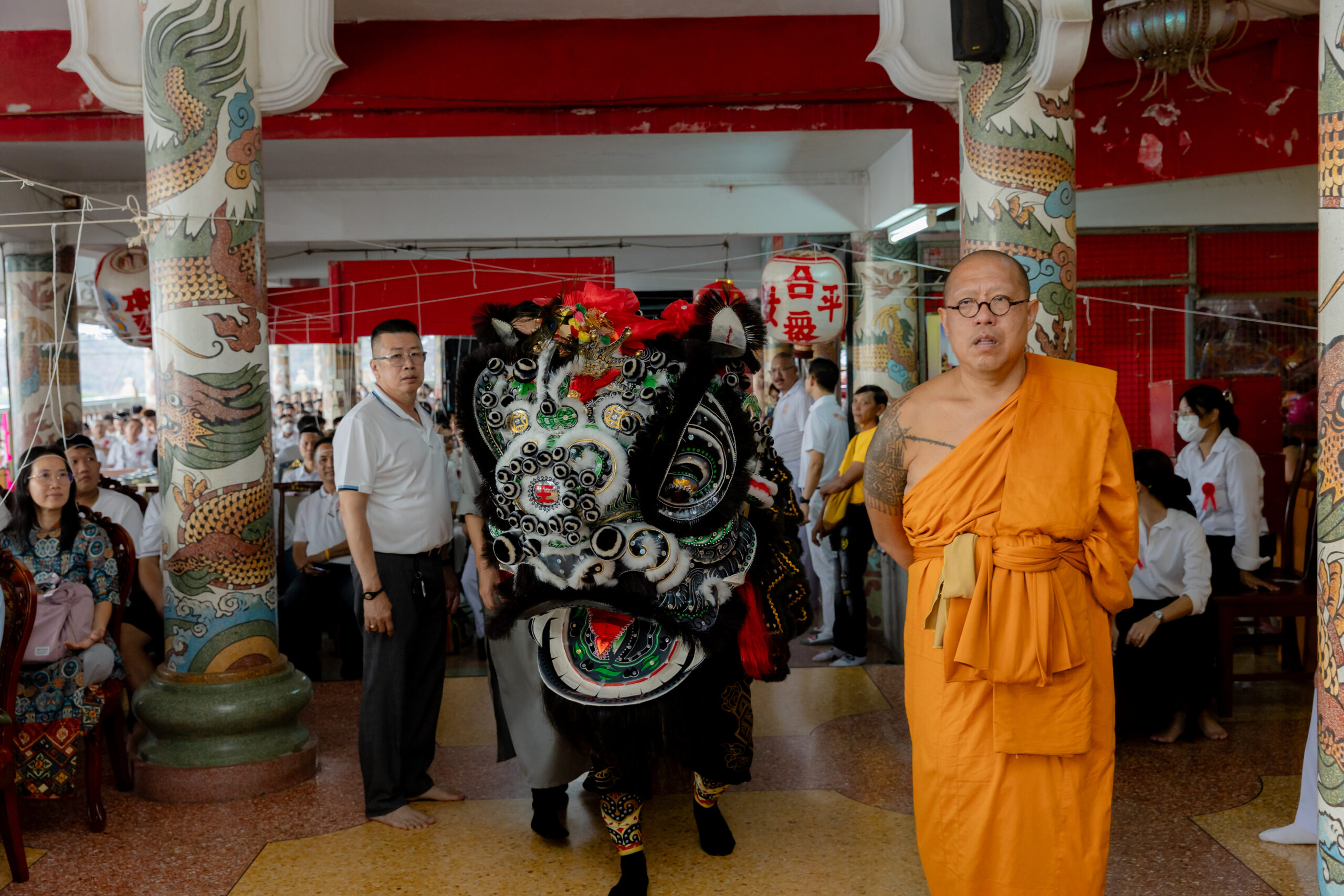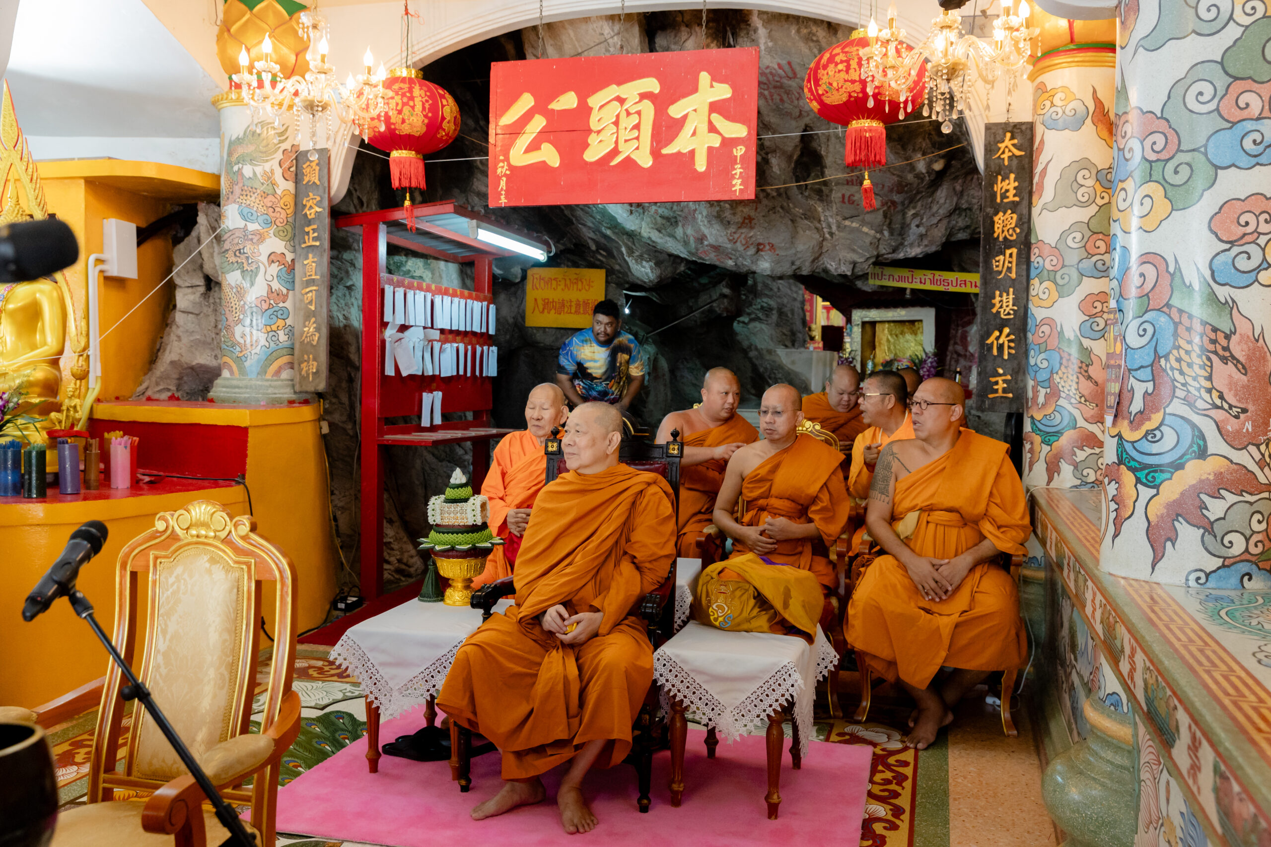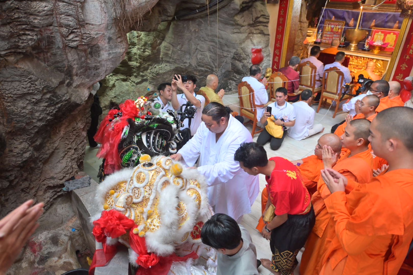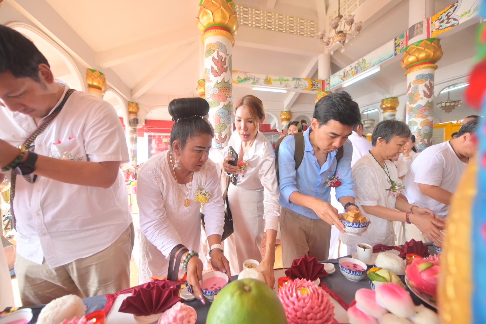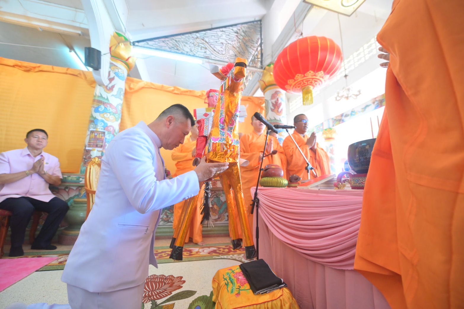 ซึ่งอาจารย์แขก รือเสาะ ได้นิมนต์ เจ้าประคุณสมเด็จพระมหารัชมงคลมุนี และคณะสงฆ์จีน พระคณาจารย์5องค์ ร่วมอธิฐานจิตพุทธาภิเษกวัตถุมงคล ต่อจากนั้น พระสงฆ์ฝ่ายจีนนิกายโดยพระราชาคณะเป็นผู้ประกอบพิธี ทำพิธีบูชา24ทวาราบาล ก็คือ 24 ทวยเทพหลักของสวรรค์ทำพิธีโดยจีนนิกายรวมถึงทำพิธีบูชา“เทพเจี่ยบึงเถากง” ก็คือเจ้าพ่อเขาใหญ่เกาะสีชัง และที่อาคารโรงลิเกด้านล่างริมทะเลด้านล่าง พระสงฆ์ฝ่ายอนัมนิกาย ก็คือฝ่ายพระญวนเป็นผู้ประกอบพิธีพิธีบูชาดาว และก็ทำพิธีเทกระจาด เพื่อโปรดวิญญาณทางทะเล