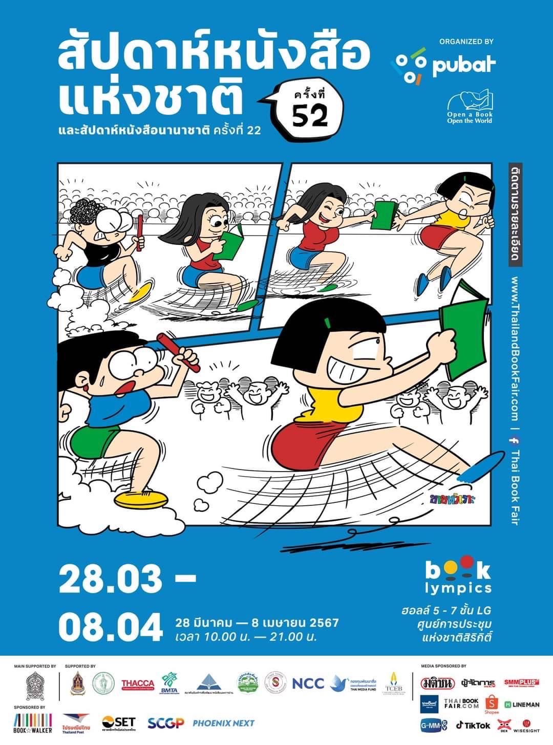 ย้ำอีกที!!! “สัปดาห์หนังสือแห่งชาติ ครั้งที่ 52 และสัปดาห์หนังสือนานาชาติ ครั้งที่ 22” จัดขึ้นระหว่างวันที่ 28 มีนาคม 2567 ถึง 8 เมษายน 2567 ตั้งแต่เวลา 10.00-21.00 น. ณ ฮอลล์ 5-7 ชั้น LG ศูนย์การประชุมแห่งชาติสิริกิติ์ ดูรายละเอียดเพิ่มเติมได้ที่ เพจ Thai Book Fair
