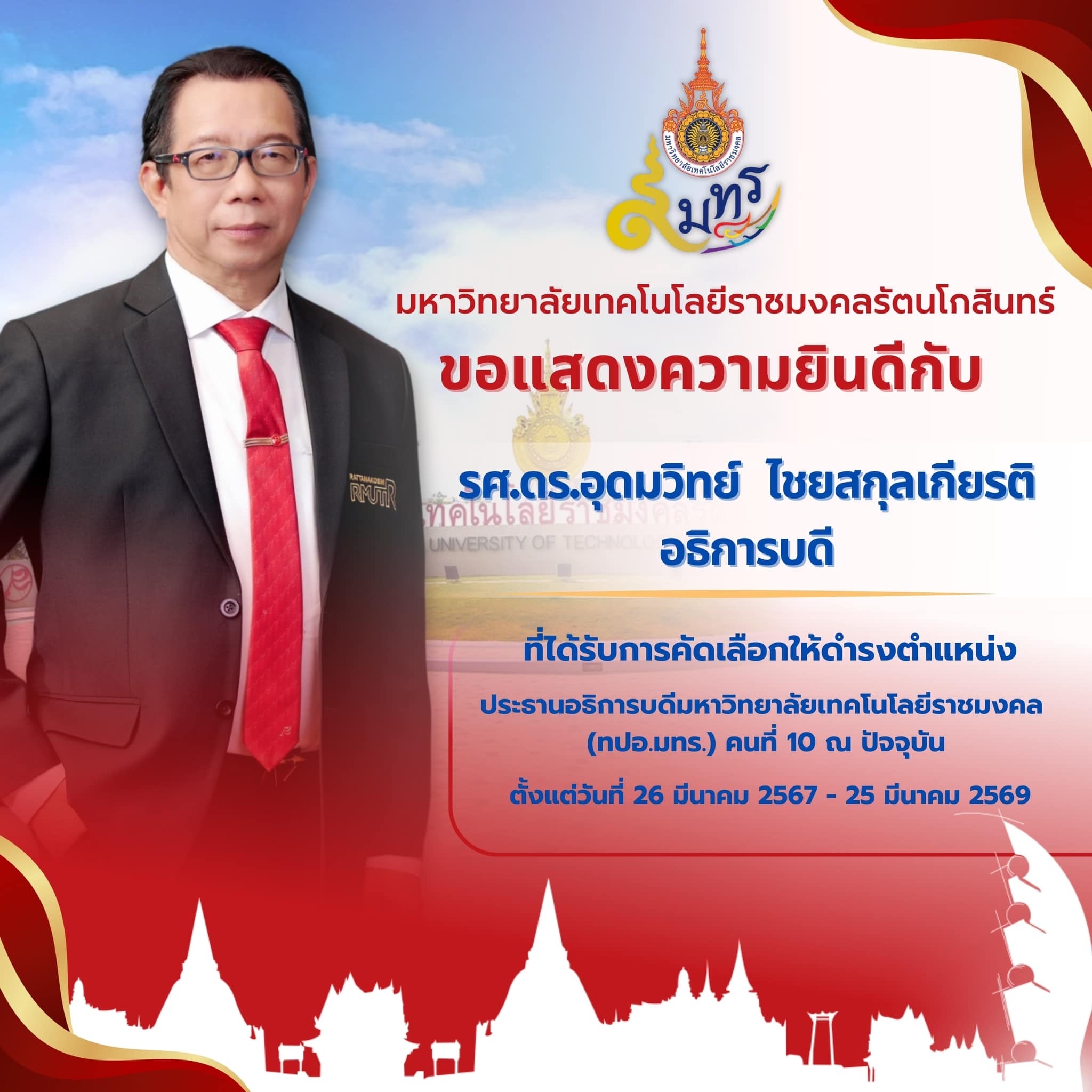 มทร.รัตนโกสินทร์ ขอแสดงความยินดีกับ รศ.ดร.อุดมวิทย์ ไชยสกุลเกียรติ อธิการบดี ที่ได้รับการคัดเลือกให้ดำรงตำแหน่งประธานอธิการบดีมหาวิทยาลัยเทคโนโลยีราชมงคล (ทปอ.มทร.) คนที่ 10 ณ ปัจจุบัน ตั้งแต่วันที่ 26 มีนาคม 2567 – 25 มีนาคม 2569