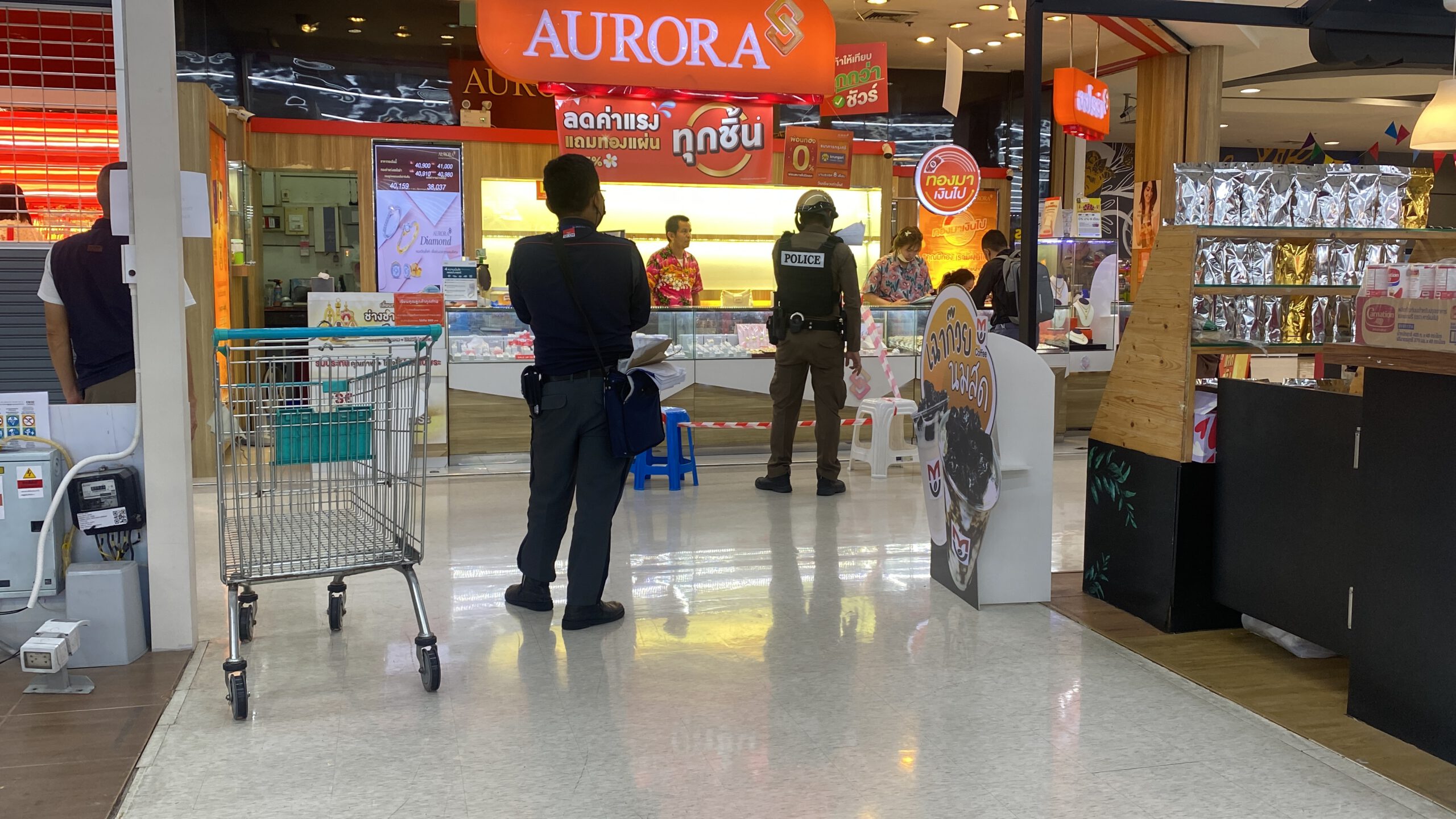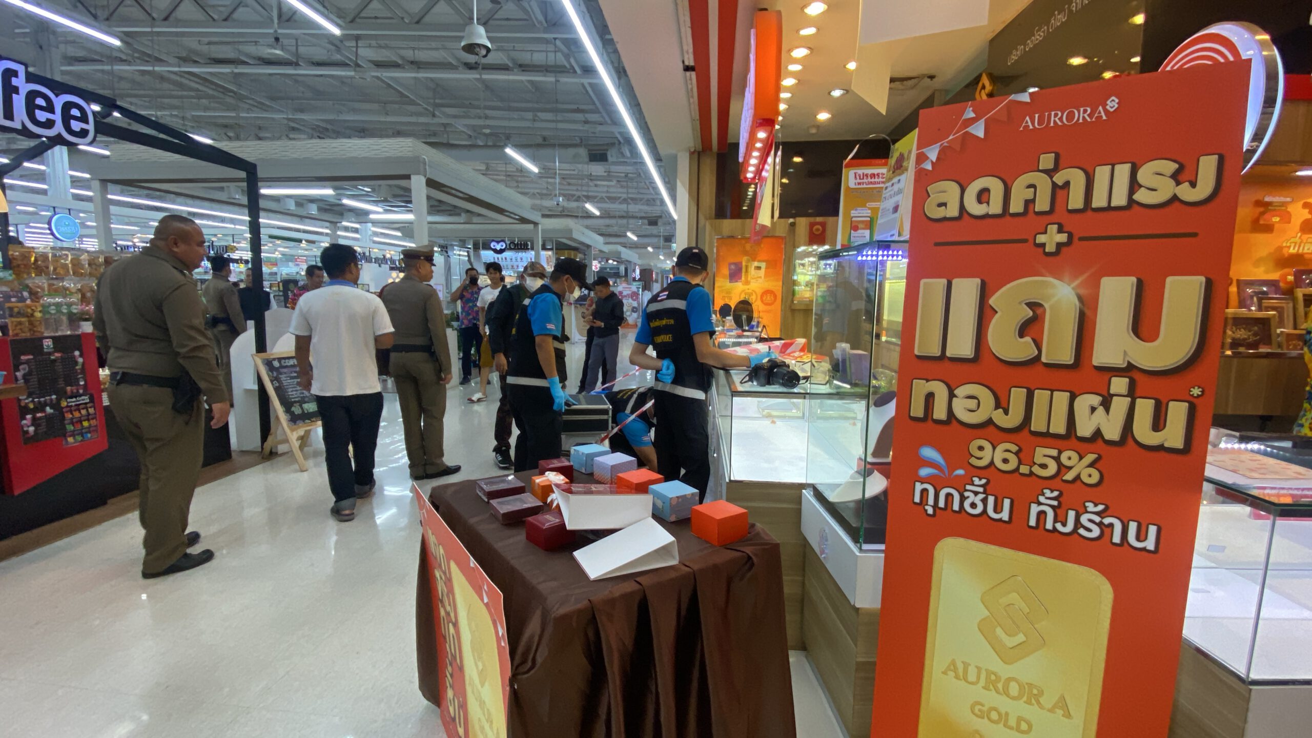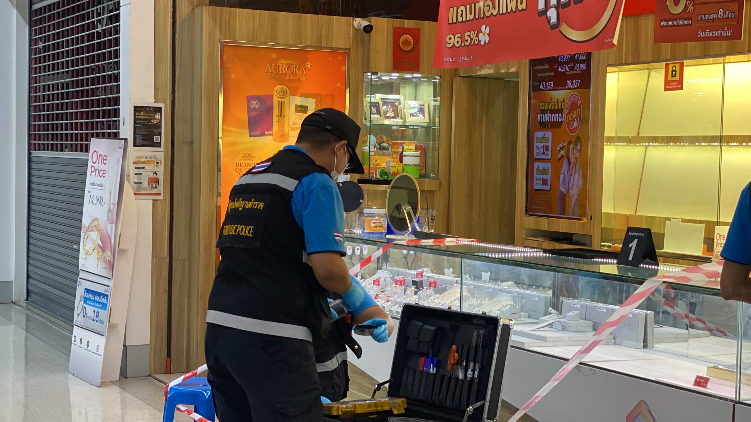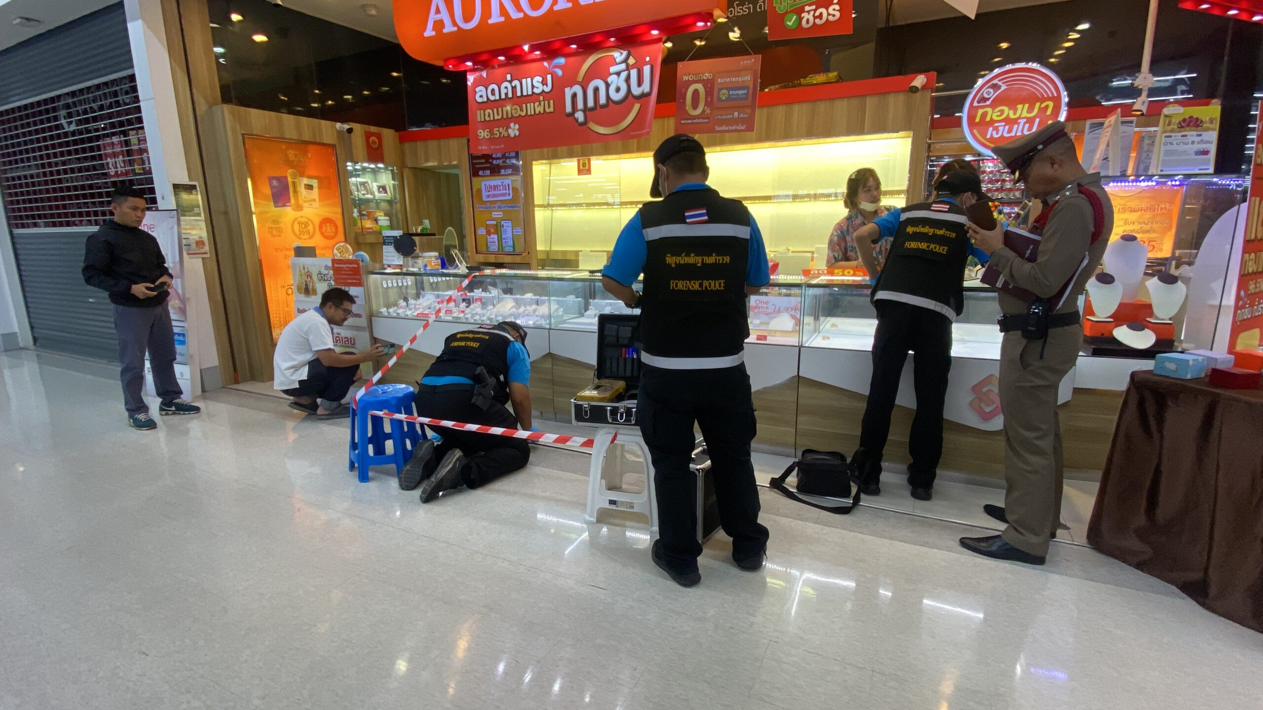 ***** ที่เกิดเหตุ ภายในห้างสรรพสินค้าชั้นที่ 2 ห้างทองออโรร่า เจ้าหน้าที่ตำรวจได้กั้นบริเวณจุดเกิดเหตุ พร้อมรายงานผู้บังคับบัญชาที่เกี่ยวข้อง พร้อม ตรวจสอบภาพจากกล้องวงจรปิด ซึ่งพบ ผู้ก่อเหตุ มาที่ห้างทอง ในเวลา 18.32 น. โดยเป็นชายรูปร่างสูง ผิวสีดำแดง สวมแมสปิดบังใบหน้า และ สวมเสื้อเชิ้ตลายดอก ขาว ดำ กางเกงขาสั้นสีขาว พร้อมสะพายกระเป๋า สีดำ สวมรองเท้าแตะรัดส้น ทำทีเข้ามาขอดูทองกับพนักงานของร้าน โดยมีการให้พนักงานนำสร้อยคอทองคำ หนัก 5 บาท ออกมาให้ดู ซึ่งทางพนักงานนำสร้อยคทองคำหนักสันละ 5 บาท อออกมาให้ดู จำนวน 4 เส้น จากนั้นผู้ก่อเหตุก็หยิบสร้อยคอทองคำ หนัก 5 บาท จำนวน 1 เส้น ขึ้นมาดู ก่อนบอกอุบายให้พนักงานเอื้อมไปหยิบกระจกมาให้ ก่อนที่ผู้ก่อเหตุจะใช้จังหวะดังกล่าววิ่งหลบหนีไปทันทีโดยวิ่งลงจากชั้น 2 ลงมาชั้นล่างและวิ่งหลบหนีออกมาทางหน้าห้างและวิ่งเลี้ยวออกมาทางทางเข้า ราม 2 และขึ้นรถ จยย.รับจ้างหลบหนีไป โดยคนร้ายได้สร้อยคอทองคำ น้ำหนัก 5 บาท ไป 1 เส้น ราคาประมาณ 210,000 บาท