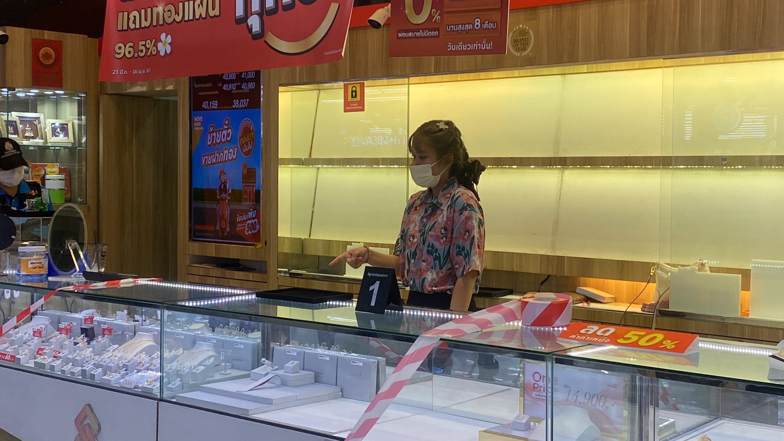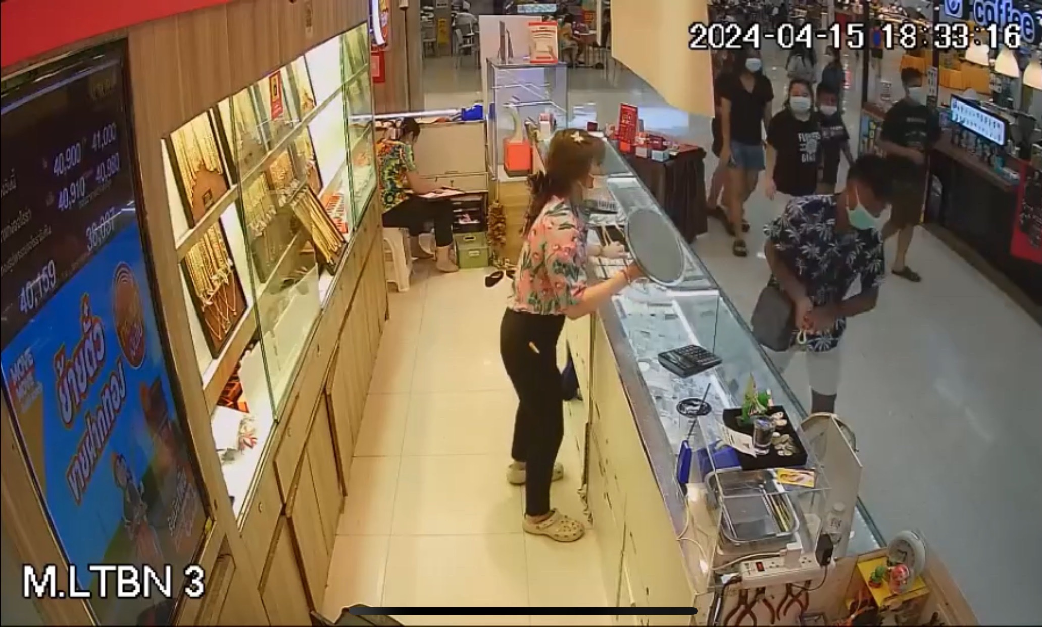 ***** ด้าน น.ส.ณัฎฐธิดา แก้วเทียมทอง อายุ 22 ปี พนักงานของร้าน เล่าว่า ผู้ก่อเหตุมาขอดูทองคำ น้ำหนัก 5 บาท ตนเองนำทองออกมาให้ดูทั้งหมดเป็น จำนวน 4 เส้น น้ำหนัก เส้นละ 5 บาท ให้ผู้ก่อเหตุดู ซึ่งผู้ก่อเหตุไม่ได้บอกกับตนว่าจะเอาทองแบบไหน ตนเองจึงหยิบแบบและน้ำหนักรวม ๆ ให้ดู ทองที่เอาให้ดูก็เป็นทองที่อยู่หน้าร้าน ผู้ก่อเหตุไม่ได้มีการหยิบไปคล้องคอ แต่ได้หยิบออกจากถาดที่วางอยู่ด้านหน้า 1 เส้นขึ้นมาดู และขอให้ตนหยิบกระจกมาให้เพื่อาจะลองใส่ดู จังหวะท่ตนหันไปหยิบกระจก คนร้ายได้เอาทองวิ่งหนีไปเลยโดย วิ่งออกไปทางขวามือและวิ่งลงไปด้านล่าง หลบหนีไป