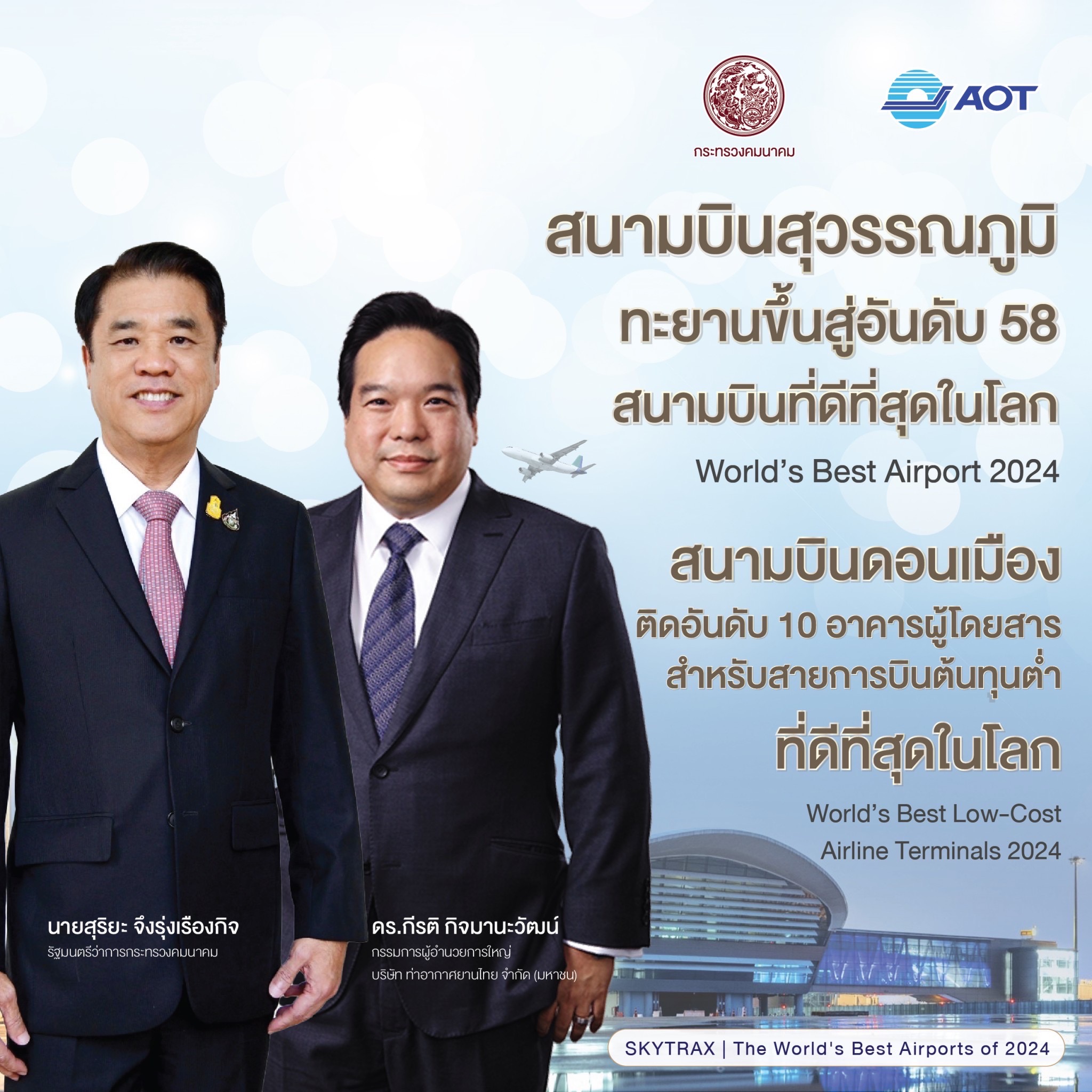 *****ดร.กีรติ กิจมานะวัฒน์ กรรมการผู้อำนวยการใหญ่ บริษัท ท่าอากาศยานไทย จำกัด (มหาชน) (AOT) กล่าวว่า ตามที่ นายเศรษฐา ทวีสิน นายกรัฐมนตรีและรัฐมนตรีว่าการกระทรวงการคลัง ตั้งเป้าหมายการผลักดันท่าอากาศยานของไทยให้ติดอันดับ 1 ใน 50 สนามบินที่ดีที่สุดในโลกภายใน 1 ปี และติดอันดับ 1 ใน 20 ของโลกภายใน 5 ปี ซึ่งนายสุริยะ จึงรุ่งเรืองกิจ รัฐมนตรีว่าการกระทรวงคมนาคม ได้ดำเนินการขับเคลื่อนนโยบายในการพัฒนาอุตสาหกรรมการบินของประเทศไทย เพื่อส่งเสริมการค้า การลงทุน และการท่องเที่ยว สร้างรายได้ฟื้นฟูเศรษฐกิจของประเทศ นั้น ในปี 2024 นี้ เว็บไซต์ Skytrax ซึ่งเป็นเว็บไซต์จัดอันดับการให้บริการของสนามบินได้ประกาศสนามบินที่ดีที่สุดในโลก (World’s Best Airport) ประจำปี 2024 ซึ่งท่าอากาศยานสุวรรณภูมิ (ทสภ.) ติดอันดับที่ 58 ขยับขึ้นจากอันดับที่ 68 โดยขึ้นมา 10 อันดับจากปี 2023 ขณะที่ท่าอากาศยานดอนเมือง (ทดม.) ติดอันดับ 10 ของสนามบินสำหรับสายการบินต้นทุนต่ำที่ดีที่สุดในโลก (World’s Best Low-Cost Airline Terminals) ซึ่งผลการจัดอันดับดังกล่าวมาจากการสำรวจความคิดเห็นของผู้เดินทางด้วยเครื่องบินทั่วโลก ภายใต้การสำรวจที่ชื่อว่า World’s Airport Survey จัดทำโดยบริษัท Skytrax ซึ่งเป็นบริษัทวิจัยและที่ปรึกษาด้านการบินชั้นนำของประเทศอังกฤษที่มีความเชี่ยวชาญในการวิเคราะห์คุณภาพการให้บริการของสายการบินและสนามบินทั่วโลก โดยคำนึงถึงหมวดการให้บริการสนามบิน เช่น การเดินทาง สภาพแวดล้อมและการออกแบบ เจ้าหน้าที่สนามบิน สิ่งอำนวยความสะดวก และการให้บริการ เป็นต้น