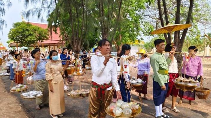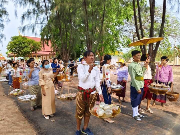 สำหรับพิธี จะมีขบวนสำรับคาวหวานที่บรรจงจัดแต่งมาอย่างงดงาม ใส่สาแหรกคานหาบ โดยชาวบ้านจะพร้อมใจสวมชุดไทย ตามแบบวิถีดั้งเดิม นำภัตตาหารมาถวายพระสงฆ์โดยวิธีการจับสลาก