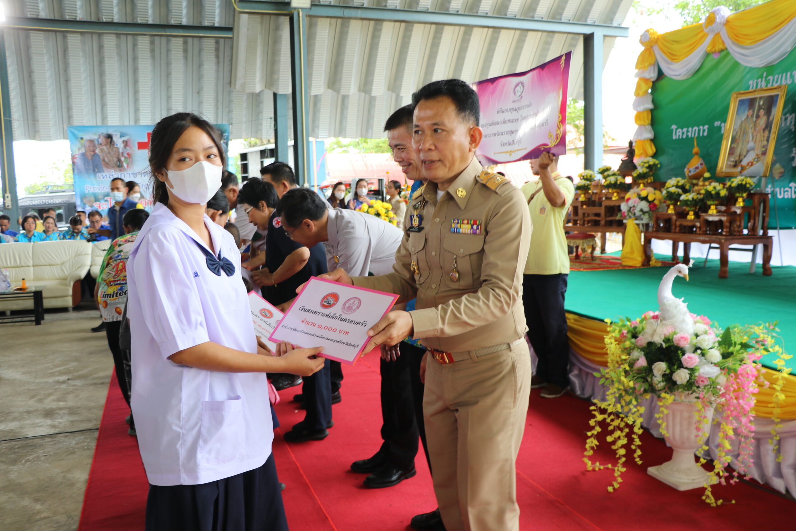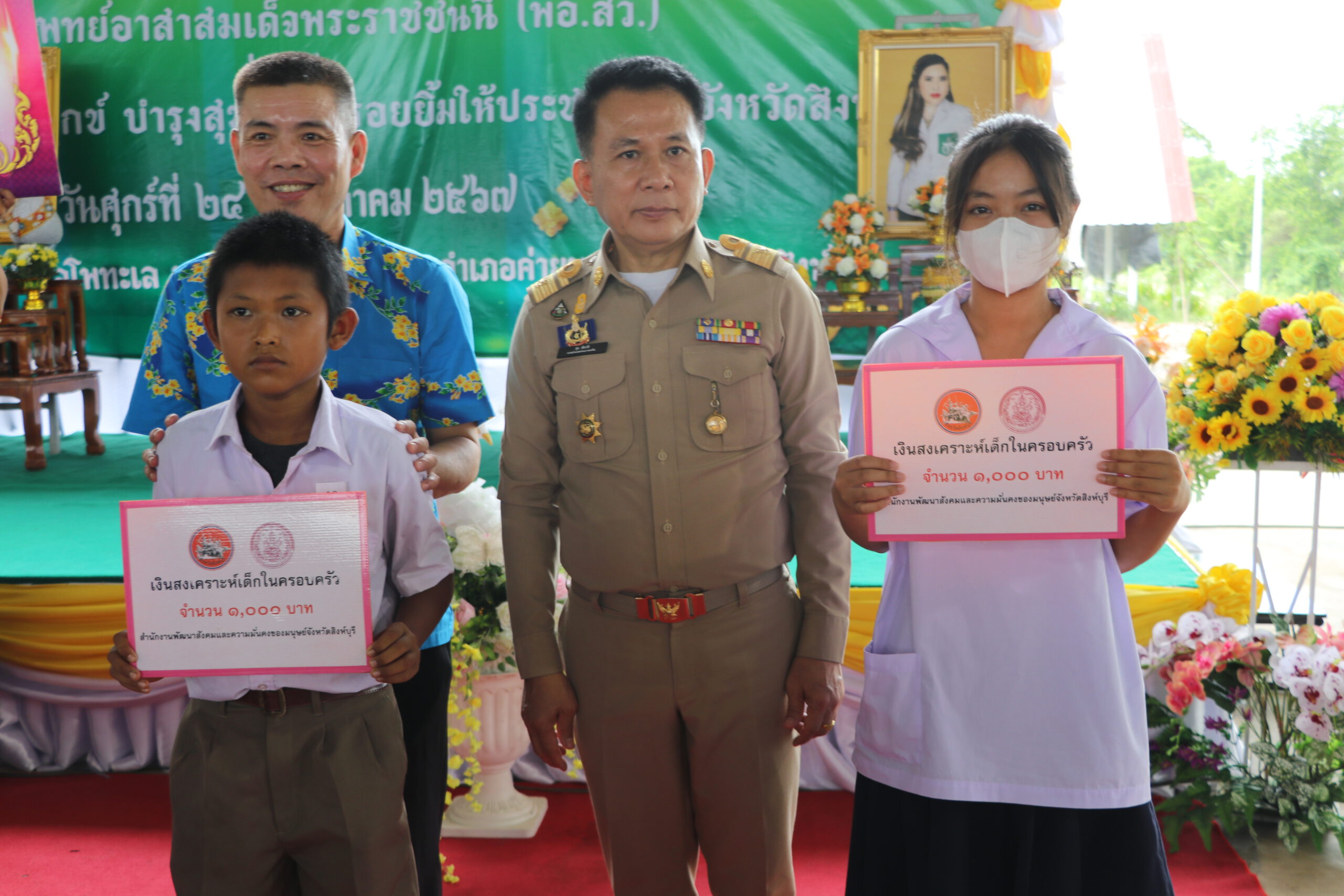 โอกาสนี้ ผู้ว่าราชการจังหวัดสิงห์บุรี พร้อมด้วย นายกเหล่ากาชาดจังหวัดสิงห์บุรี รองผู้ว่าราชการจังหวัดสิงห์บุรี กอ.รมน.สิงห์บุรี และหัวหน้าส่วนราชการ มอบทุนการศึกษาและสิ่งของต่าง ๆ ให้แก่เด็กและประชาชน อาทิเช่น เหล่ากาชาดจังหวัดสิงห์บุรี มอบถุงยังชีพ จำนวน 100 ชุด แว่นสายตายาวพร้อมซอง จำนวน 500 อัน / สำนักงานพัฒนาชุมชนจังหวัดสิงห์บุรี มอบทุนการศึกษาแก่เด็กและนักเรียนที่มีฐานะยากจนแต่มีผลการเรียนดี จากกองทุนพัฒนาเด็กชนบทในพระราชูปถัมภ์ สมเด็จพระกนิษฐาธิราชเจ้า กรมสมเด็จพระเทพรัตนราชสุดาฯ สยามบรมราชกุมารี จำนวน 10 ทุนๆละ 1,000 บาท / สำนักงานพัฒนาสังคมและความมั่นคงของมนุษย์จังหวัดสิงห์บุรี มอบเงินสงเคราะห์ครอบครัวสำหรับเด็กในสภาวะยากลำบาก จำนวน 20 ทุนๆ ละ 1,000 บาท