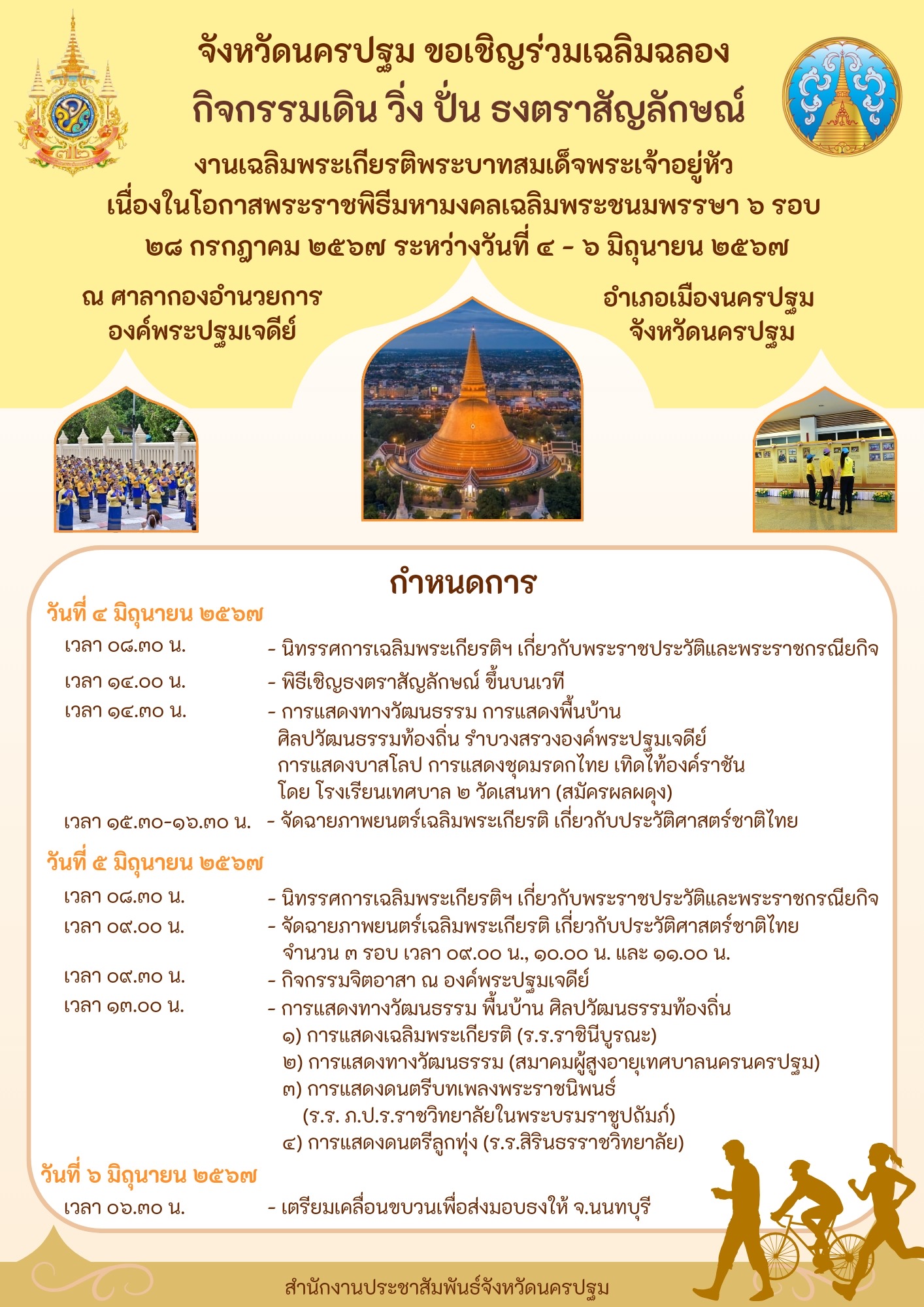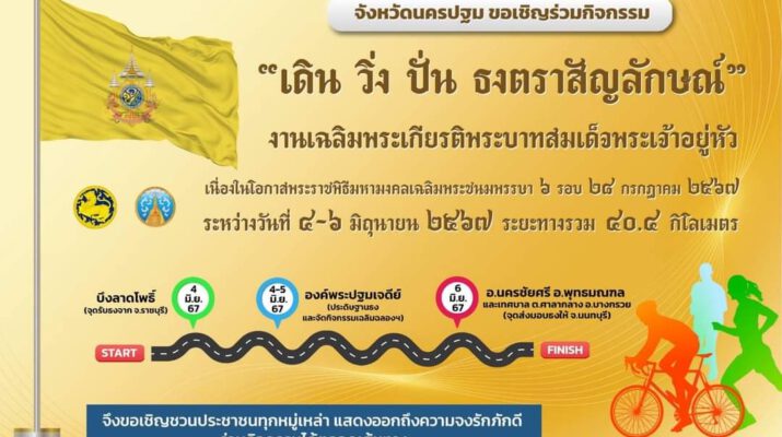 จังหวัดนครปฐม ขอเชิญเข้าร่วมกิจกรรมเดิน วิ่ง ปั่น ธงตราสัญลักษณ์ งานเฉลิมพระเกียรติพระบาทสมเด็จพระเจ้าอยู่หัว เนื่องในโอกาสพระราชพิธีมหามงคลเฉลิมพระชนมพรรษา 6 รอบ 28 กรกฎาคม 2567 ระหว่างวันที่ 4 – 6 มิถุนายน 2567