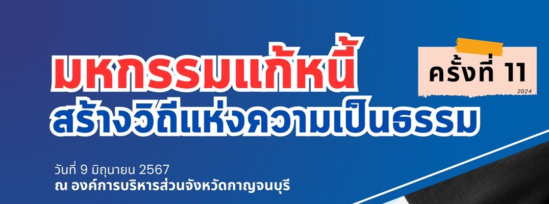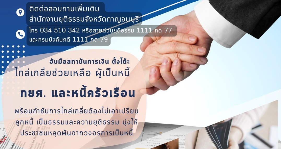 วันที่ 4 มิถุนายน 2567 พันตำรวจเอก สอดส่องรัฐมนตรีว่าการกระทรวงยุติธรรม จับมือ นายสุรพงษ์ ปิยะโชติ รัฐมนตรีช่วยว่าการกระทรวงคมนาคม ลุยเมืองกาญจน์ จัด “มหกรรมแก้หนี้ สร้างวิถีแห่งความเป็นธรรม” ครั้งที่ 11 จับมือสถาบันการเงินตั้งโต๊ะ ไกล่เกลี่ยช่วยเหลือผู้เป็นหนี้ “กยศ.” และ “หนี้ครัวเรือน” พร้อมกำชับการไกล่เกลี่ยต้องไม่เอาเปรียบลูกหนี้ เป็นธรรมและความยุติธรรม มุ่งให้ประชาชน หลุดพ้นจากวงจรการเป็นหนี้