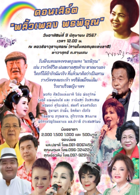 คอนเสิร์ต “พลิ้วเพลงพรพิรุณ” แสดงในวันอาทิตย์ที่ 9 มิถุนายน 2567 ดำเนินรายการโดยพิธีกรขวัญใจมหาชน ม.ล.ปราลี ประสมทรัพย์
