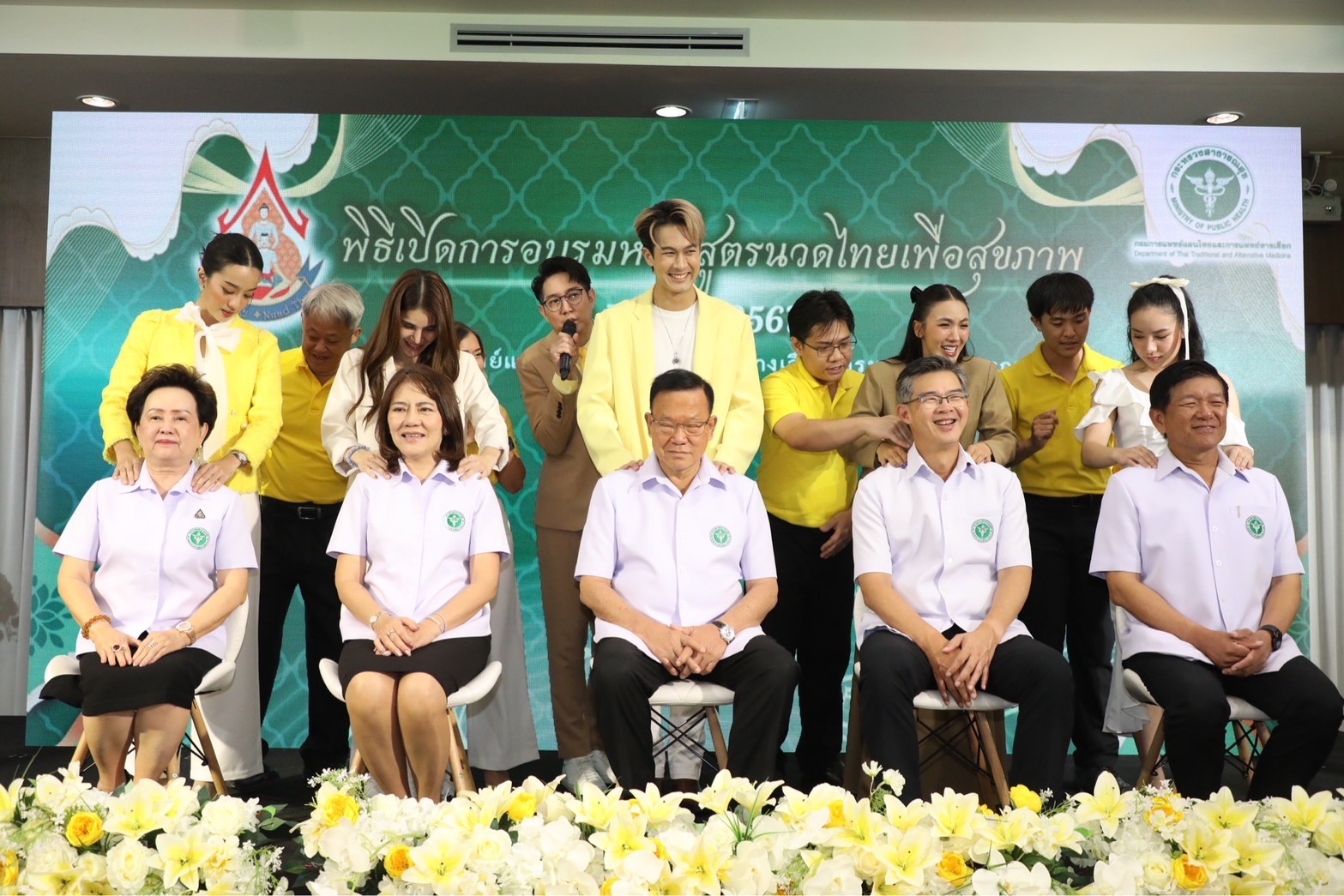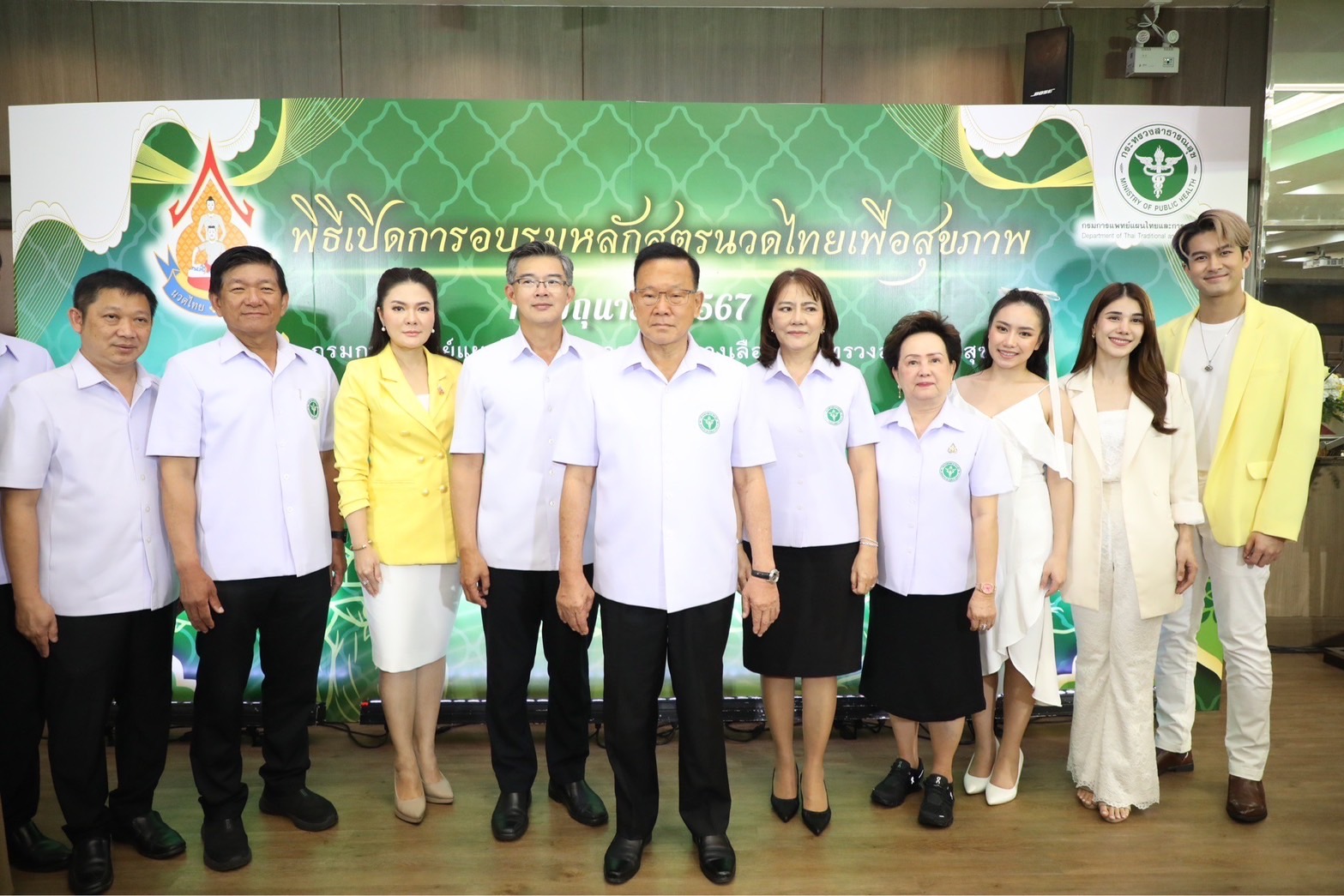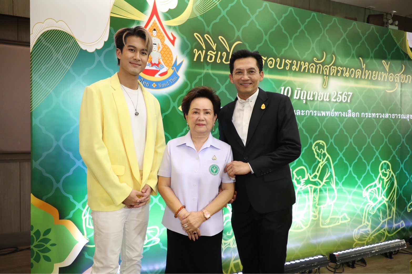 “ภูมิ”เกียรติภูมิ บันลือชัยฤทธิ์ พระเอกจากละคร “ขวัญหล้า” ทางช่อง 7HD กล่าวส่งเสริม “วันนี้มีโอกาสได้มาร่วมพิธีเปิดอบรมหลักสูตรนวดไทย ของกรมการแพทย์แผนไทยฯ ส่วนตัวรู้สึกดี ได้รับประโยชน์จากการสาธิตวิธีการนวดที่คงไว้ซึ้งเป็นอัตลักษณ์ไทย คือความนุ่มนวลแต่หนักแน่น และมีมารยาท ส่วนตัวอยากเรียนรู้ศึกษาไว้ ถือว่าเป็นวิชาติดตัวใช้ได้กับคนในครอบครัว อยากจะเชิญชวนคนชอบนวดมาสมัครเข้ารับการอบรม เพราะสามารถเป็นวิชาหาเลี้ยงชีพ และนำไปต่อยอดได้ด้วย”
